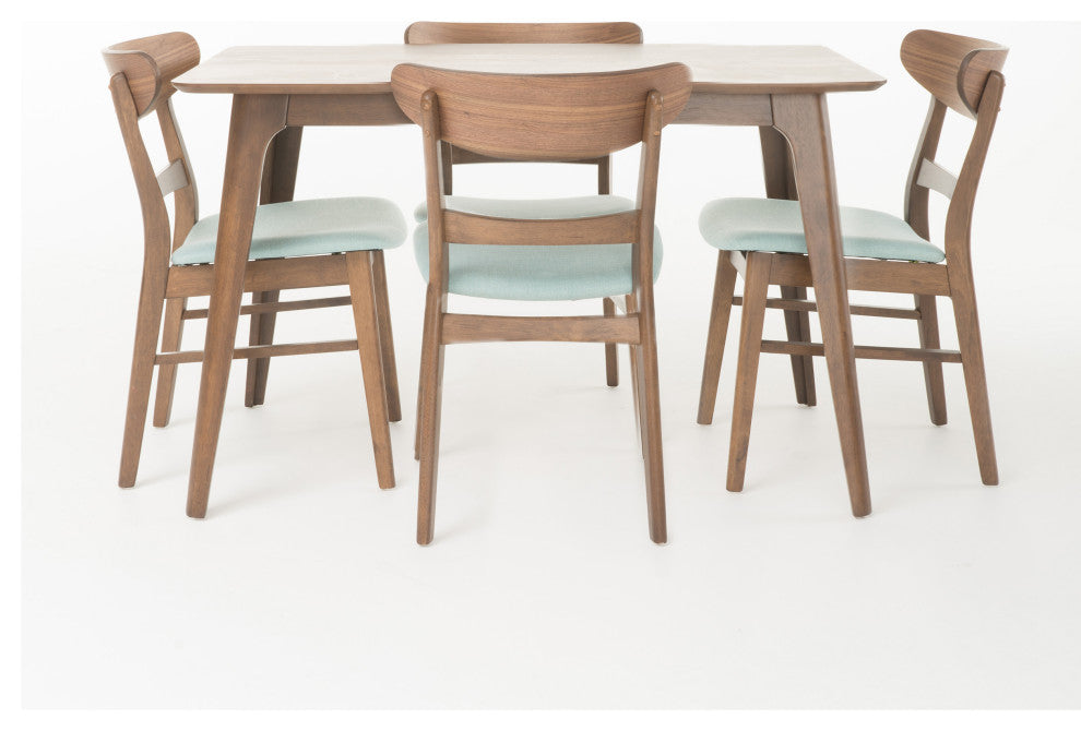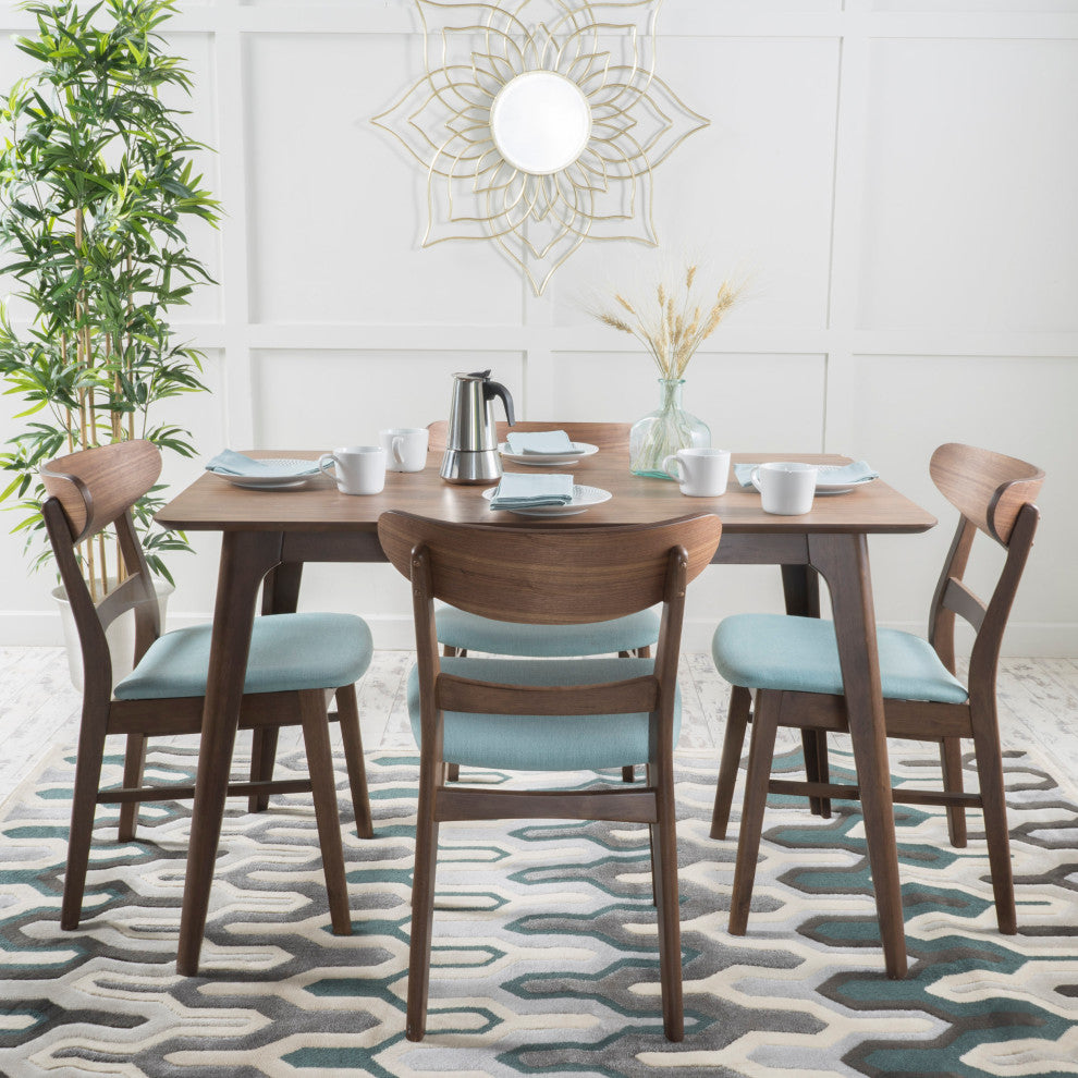 With matching wood finishes, you can''t go wrong with this dining set. Including one table and four chairs, this set is ideal for any home. The mid-century style and smooth wood finishes of this set will complement any decor, making this a perfect addition for your interior space. The dining chairs feature a sturdy design with lovely upholstered seats that provide both comfort and style for your dining pleasure. Whether you are hosting a casual dinner with friends or dining with your family, this set will make every meal a memorable one. MID-CENTURY DESIGN: Blending together iconic splayed legs with a stunning wood frame, our dining set offers a mid-century look to your lounge space. With its clean lines and understated look, this set uses new materials to reimagine a traditional design. RUBBERWOOD LEGS: Our environmentally-friendly wood not only offers plenty of durability, but it also gives this piece a beautiful natural-grain look. Combined with a gorgeous finish, this wood will truly stand out in any room.UPHOLSTERED SEATING: These chairs offer beautifully upholstered seating, giving any room a refined appearance. This provides a smooth, immaculate texture for this piece as well as a splash of color for the overall set. RECTANGULAR TABLE: This set includes a rectangular table that comfortably seats four people. This has dimensions of 47.20" W x 29.50" D x 29.50" H, allowing enough space for you and your hearty meals.ASSEMBLY REQUIRED: Some assembly is required for this dining set. All of the instructions and tools needed for assembly are included. Please note that this set is not for commercial use. Includes: One (1) Table and Four (4) ChairsTabletop Material: Faux Wood with Walnut VeneerTable and Chair Leg Material: RubberwoodSeat Material: FabricFabric Composition: 100% PolyesterFinish: Natural WalnutSeat Color: MintHand-Crafted DetailsAssembly RequiredTable Dimensions: 29.53 inches deep x 47.24 inches wide x 29.53 inches highChair Dimensions: 19.60 inches deep x 20.60 inches wide x 30.80 inches highSeat Dimensions: 17.60 inches deep x 16.60 inches wide x 18.00 inches high