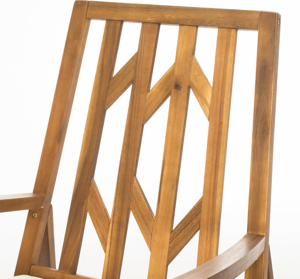 This acacia wood rocking chair with matching table is sure to be the perfect addition to your patio. The acacia wood frame is both great for outdoor furniture as well as beautiful to look at. The cushion is made from a water resistant fabric that helps prolong the life of your outdoor rocking chair. Overall, this product will be a great addition to your patio and allows you to comfortably enjoy your back yard all summer long.Features:Includes: One (1) Rocking Chair and One (1) TableMaterial: Acacia WoodCushion Material: Water Resistant FabricCushion Color: WhiteAssembly RequiredDimensions: 37.75"D x 26.50"W x 41.25"HTable Dimensions: 15.00"D x 19.00"W x 19.25"H
