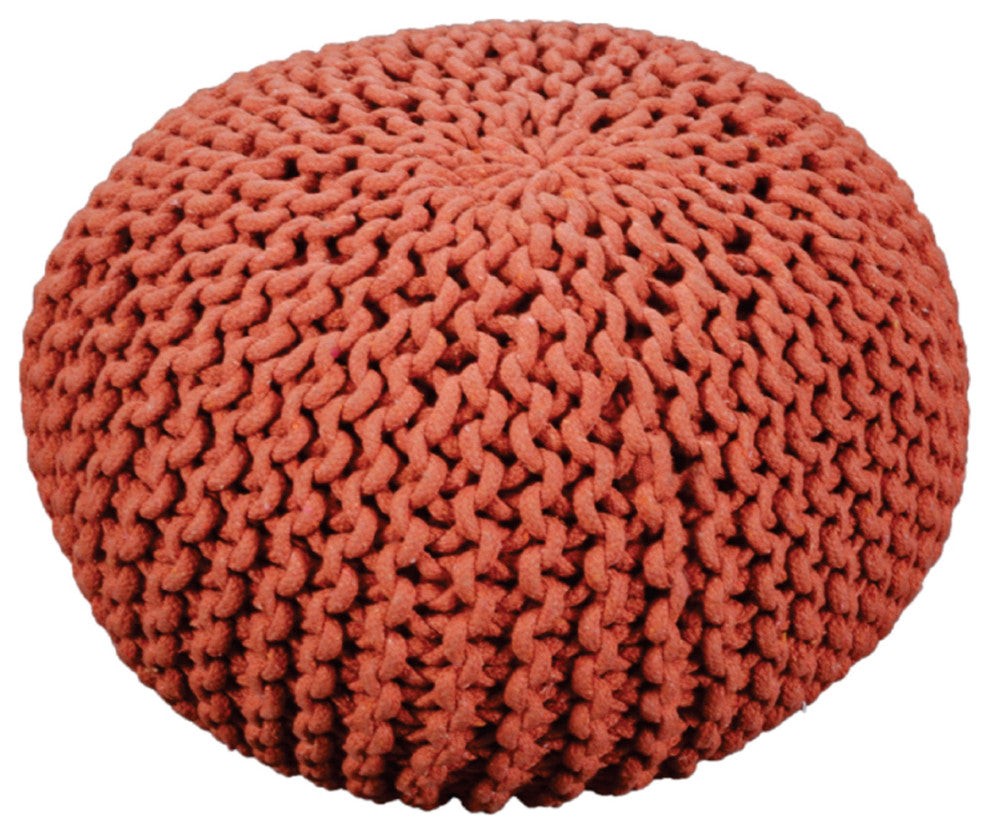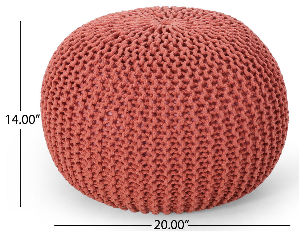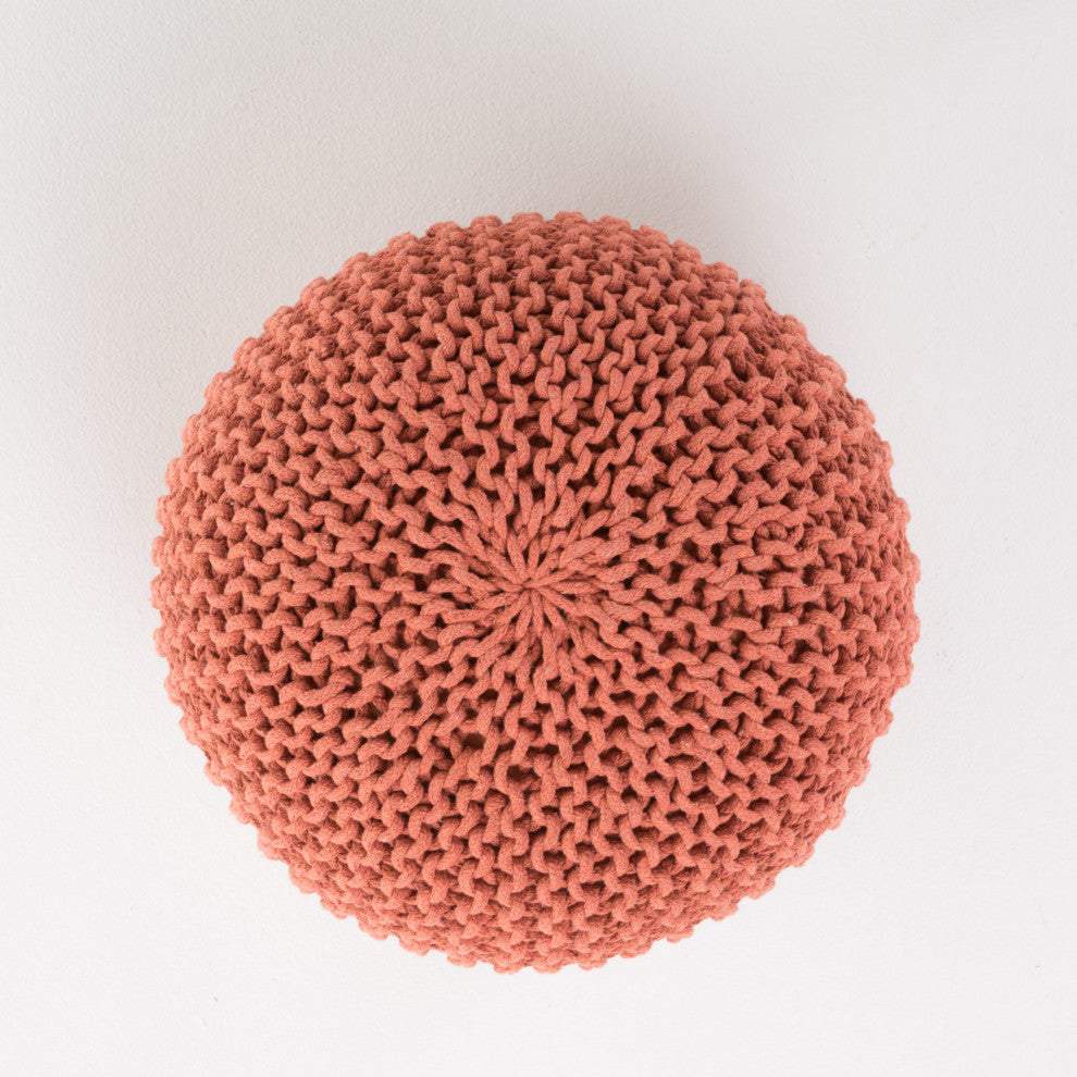 Live boldly with the ideal statement piece by giving your home this bestseller knitted pouf that offers both comfort and style to any room. The compact pumpkin shape and classic cable knit makes this the perfect seating for children in a nursery or a colorful footrest in a stylish living room. Whether you"™re looking to put your feet up after a long day or if you"™re in need of extra plush seating, this pouf offers a variety of functions for you and your guests to discover. MODERN DESIGN: Our pouf is ideal for those who enjoy simple, uncluttered spaces but still want to receive the full experience of the product''s functions. With its refreshing color and soft design, this lovely round pouf is a perfect accessory for any modern home.HANDCRAFTED DESIGN: This accessory is expertly designed and handcrafted with artisan expertise. Any natural variations are not product flaws, but rather, will ensure that your purchase is truly a one-of-a-kind product.KNIT WEAVE: Our pouf brings a charming coziness to your home with its delightful knit weave cover. Not only does this give your home a snug look but it also brings a splash of texture to your decor. DIMENSIONS: Choose an accessory that is the perfect size for you and your furniture. This pouf is 20.00"� W x 20.00"� D x 14.00"� H. You will love how much your space can transform with the simple addition of this charming pouf. NO ASSEMBLY: This pouf comes ready to use straight out of the box. No assembly is required.Includes: One (1) PoufMaterial: CottonFilling Material: Polystyrene BeadsColor: CoralHand-Crafted DetailsNo Assembly RequiredDimensions: 20.00 inches deep x 20.00 inches wide x 14.00 inches high
