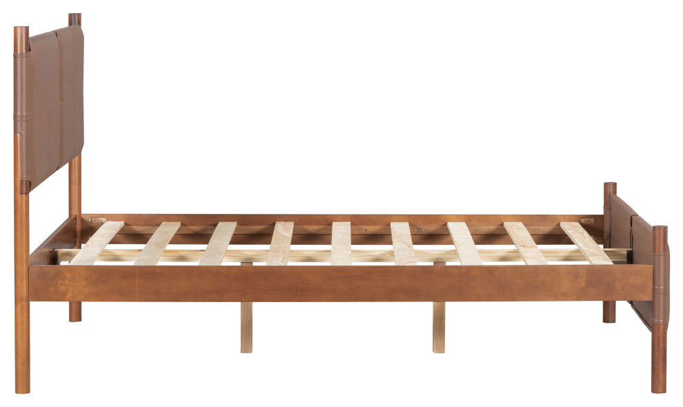 Upgrade your bedroom with this queen-size platform bed, featuring a stylish PU leather headboard and a sturdy solid wood frame. The rich brown upholstery pairs beautifully with the natural wood finish, creating a warm and sophisticated look. Designed for durability and support, this bed eliminates the need for a box spring, making it a perfect choice for modern and classic spaces alike.• • VERSATILITY: Modern design complements contemporary and minimalist bedroom styles, fitting various decor themes• • LUXURY: Elegant PU leather headboard and natural wood finish create a sophisticated and comfortable sleep environment• • DURABILITY: Solid wood frame and sturdy slats ensure long-lasting support and stability• • EASY MAINTENANCE: PU leather upholstery is simple to clean, keeping the bed looking fresh with minimal effort• Includes: One (1) Platform Bed and Headboard Set• Sturdy wood frame• Elegant PU leather design• No box-spring needed• Sturdy slats• Natural wood grain coloring• Easy assembly• DIMENSIONS: 84.75" W x 62.25" D x 46.25" H• Weight Capacity: 800 lb