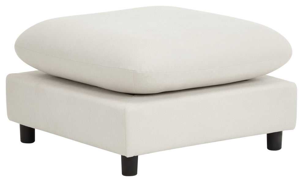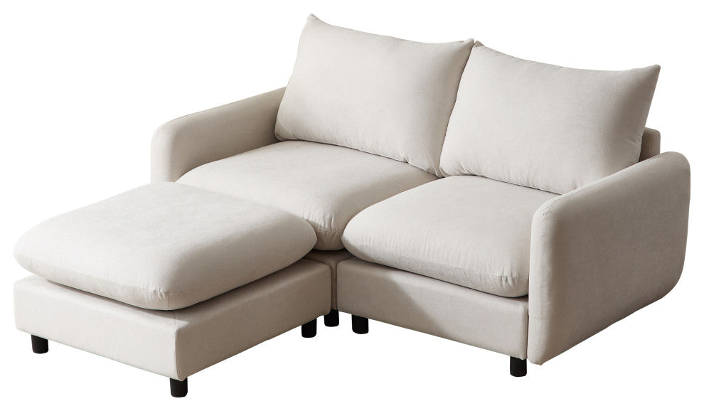 Upgrade your living space with this modern upholstered modular sectional sofa with ottoman, combining style, comfort, and versatility. Built with a durable eucalyptus wood frame and upholstered in a soft white sand fabric, it''s designed for lasting elegance. The modular design and included ottoman make it easy to customize your seating arrangement, perfect for lounging, entertaining, or relaxing in any space.• • VERSATILITY: Modular design allows you to easily rearrange and customize the layout to suit any room or occasion, offering flexibility in your living space.• • LUXURY: Soft white sand fabric, elegant design, and plush seating provide a luxurious lounging experience, perfect for enhancing your home''s aesthetic.• • DURABILITY: Constructed with a solid wood frame and reinforced S-shaped springs, ensuring long-lasting stability and support for years to come.• • EASY MAINTENANCE: The fabric is easy to clean and maintain, keeping your sectional looking fresh and inviting with minimal effort.• Includes: One (1) Sectional Sofa Set with Ottoman• Solid wood frame with reinforced S-shaped springs for comfort and stability• Modular design for easy rearrangement to fit your space• Made from eucalyptus, plywood, and white sand fabric• Simple assembly with metal connectors for secure attachment• DIMENSIONS: 35.5" L x 69" W x 34" H• SEAT: 17.5" H• OTTOMAN: 31.50" L x 31.50" W x 17.25" H