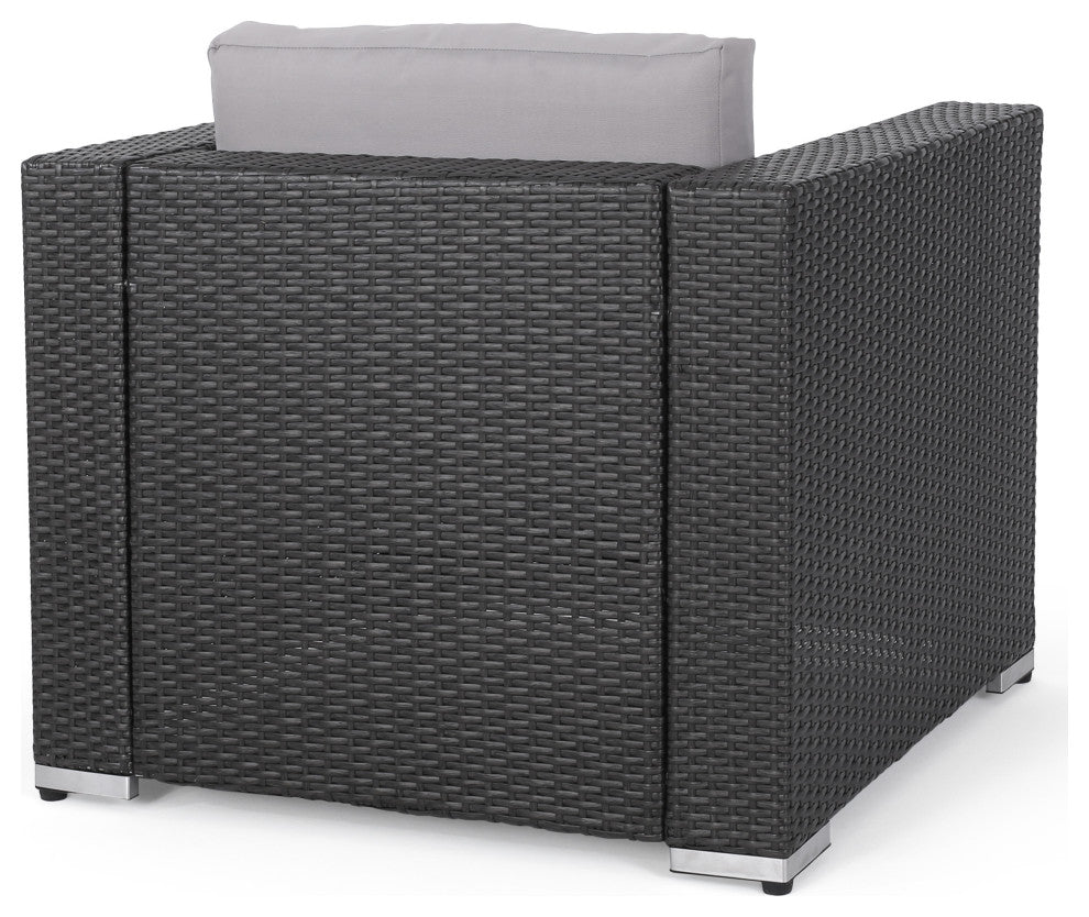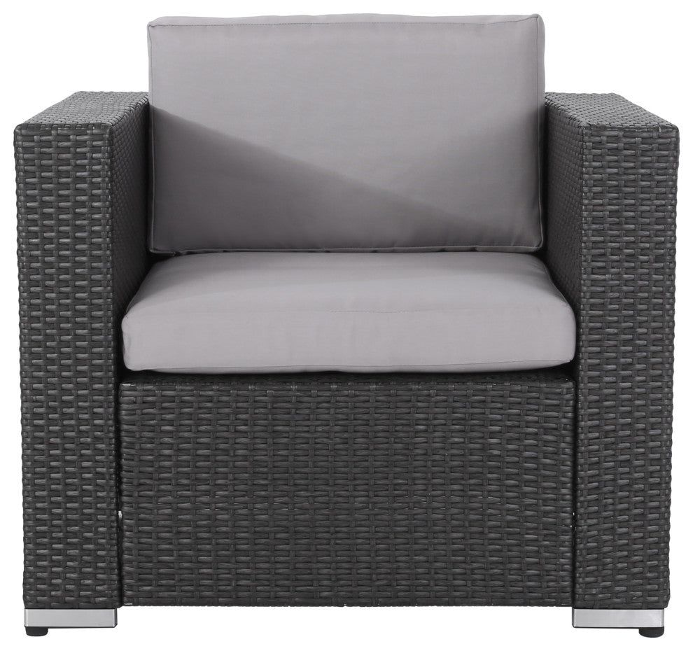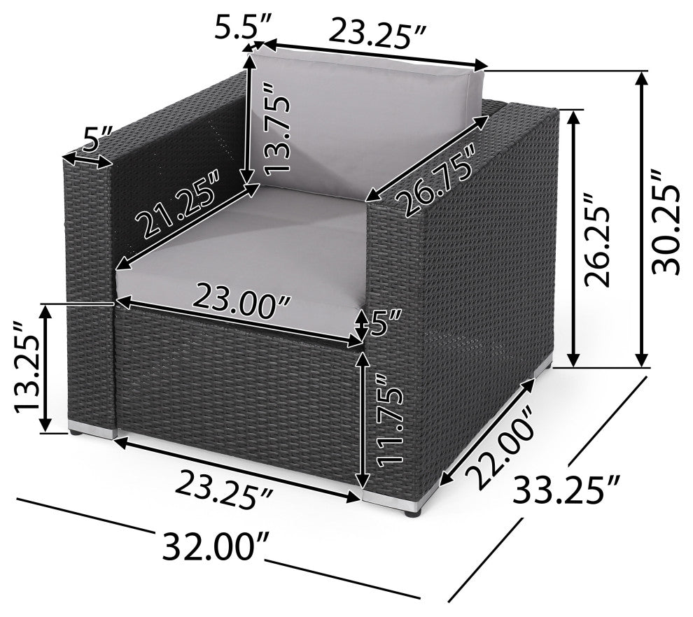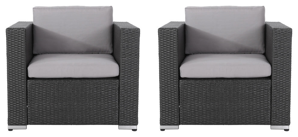 Whether you''re entertaining guests or just enjoying a relaxing weekend with your family, you now have ample space to sit and relax outside. These club chairs offer soft outdoor cushions that are both classy and efficient with water-resistant fabric. This generous set adds the perfect elegance to your outdoor space.Verin Outdoor Gray Wicker Club Chairs, Silver Water Resistant Fabric CushionsFeatures:Includes: Two (2) Club ChairsMaterial: Polyethyne WickerCushion Material: Water Resistant FabricFabric Composition: 100% PolyesterWicker Finish: GrayCushion Color: SilverEasy To AssembleDimensions:32.75" D x 31.75"W x 26.00"H