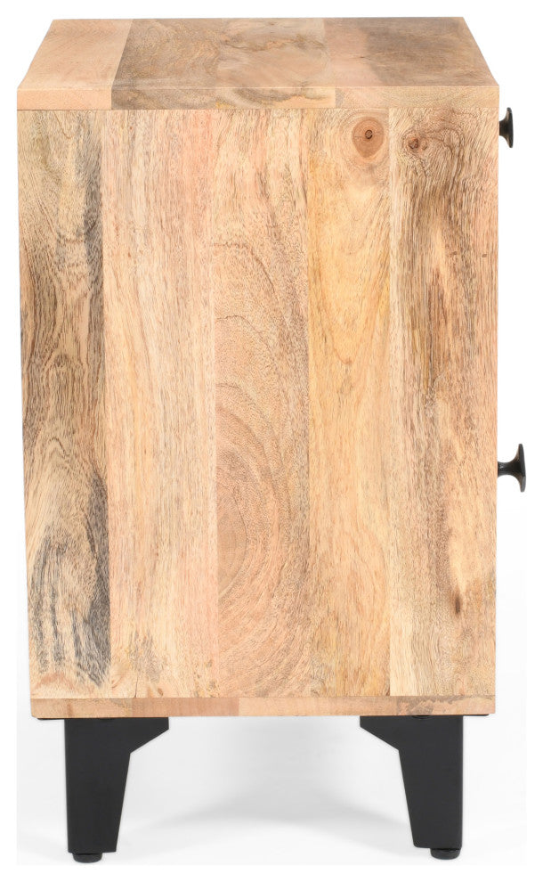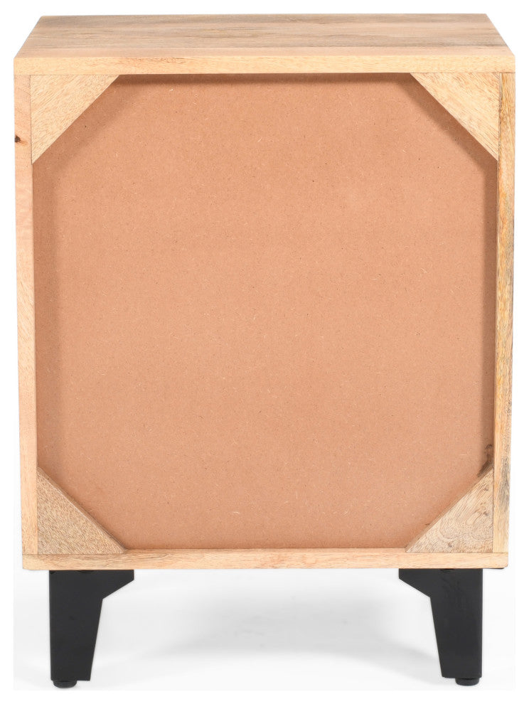Artisan Handcrafted Charm: Featuring a natural finish and unique hand-carved line designs on the cabinet front, each piece showcases variations that add character and elegance to any decor.• Ideal for Compact Spaces: Perfectly sized at 18.00" W x 14.00" D x 24.00" H, this nightstand fits snugly in small bedrooms, living rooms, or narrow areas, serving as an end table, side table, or bedroom storage solution.• Effortless Functionality: The smooth-gliding drawer provides easy access to your essentials, ensuring books, electronics, or personal items are always within easy reach and neatly stored.• Durable Craftsmanship: Constructed from premium solid mango wood and MDF, this nightstand ensures robust durability and stability for long-lasting use, supporting up to 50 lbs.• Simple Assembly: Includes clear instructions and all necessary hardware for quick and easy assembly, allowing you to set it up and enjoy its functional beauty with minimal effort.• Include: One (1) NightstandMaterial: Mango Wood + PlywoodColor: NaturalAssembly RequiredDimensions: 14.00 inches deep x 18.00 inches wide x 24.00 inches high