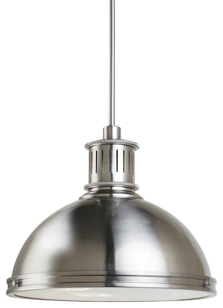 Blubs Not IncludedThe Generation Lighting Lighting Pratt Street Metal three light indoor pendant in brushed nickel supplies ample lighting for your daily needs, while adding a layer of today''s style to your home''s decor. Inspired by industrial lighting, these hard-working, large-scale pendants put light where you need it, while making a significant design statement. Pratt Street is offered in a choice of Prismatic Glass or Machine-Shaped Metal styles. Fully enclosed, a prismatic diffusor spreads light output evenly and alleviates glare.-Featured in the decorative Pratt Street Metal collection-clear textured glass diffuser-Includes three 12" stems and one 6" stem for adjustable mounting heights.-Easily converts to LED with optional replacement lamps-UL listed for damp locations-Supplied with 6 feet of wire