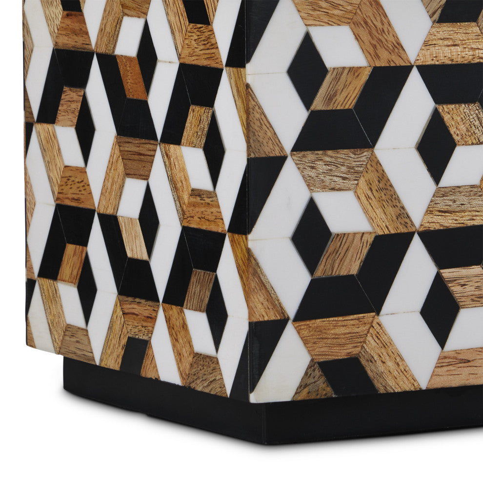 Made of mango wood, the Geo Table Lamp is covered in pieces of natural mango wood, white bone, and black composite in an octagonal multi-colored pattern. Each piece of the complex puzzle is cut and applied by hand, making this a painstaking composition to realize. The plinth base in black that matches the inset section on the top of the body in scale enhances the sophistication of the lamp, as does the shape of the white linen shade.