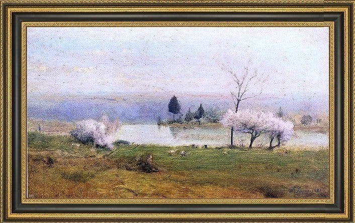 15" x 30" George Inness Pond at Milton on the Hudson framed premium canvas print reproduced to meet museum quality standards. Our Museum quality canvas prints are produced using high-precision print technology for a more accurate reproduction printed on high quality canvas with fade-resistant, archival inks. Our progressive business model allows us to offer works of art to you at the best wholesale pricing, significantly less than art gallery prices, affordable to all. This artwork is hand stretched onto wooden stretcher bars, then mounted into our 3 3/4" wide gold finish frame with black panel by one of our expert framers. Our framed canvas print comes with hardware, ready to hang on your wall., We present a comprehensive collection of exceptional canvas art reproductions by George Inness.