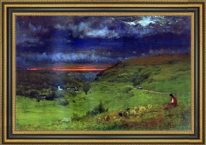 16" x 24" George Inness Sunset at Etretat framed premium canvas print reproduced to meet museum quality standards. Our Museum quality canvas prints are produced using high-precision print technology for a more accurate reproduction printed on high quality canvas with fade-resistant, archival inks. Our progressive business model allows us to offer works of art to you at the best wholesale pricing, significantly less than art gallery prices, affordable to all. This artwork is hand stretched onto wooden stretcher bars, then mounted into our 3 3/4" wide gold finish frame with black panel by one of our expert framers. Our framed canvas print comes with hardware, ready to hang on your wall., We present a comprehensive collection of exceptional canvas art reproductions by, George Inness .