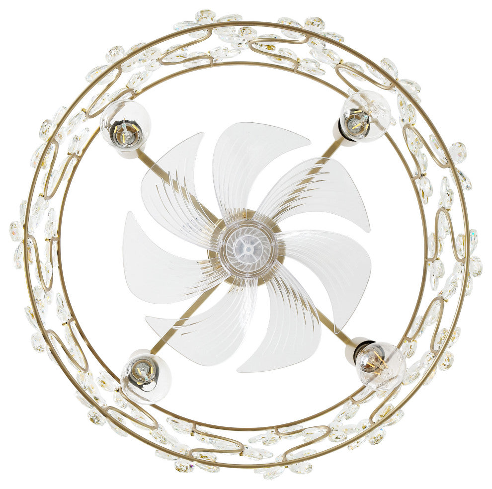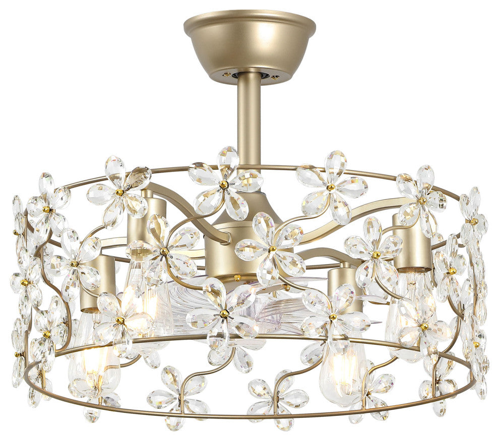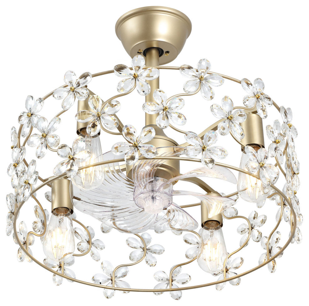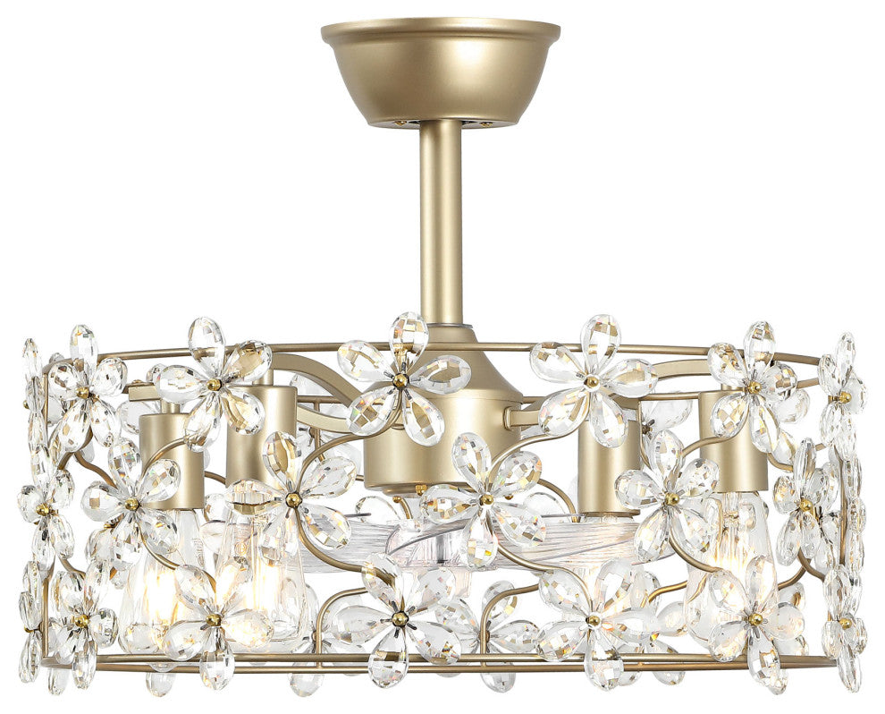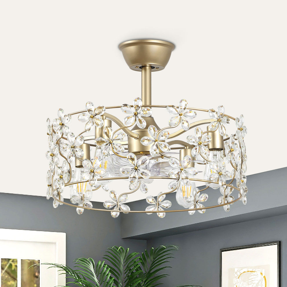 Elevate your home with this luxurious floral crystal ceiling fan. Featuring a gold metal frame, this semi-flush mount fixture is adorned with delicately handcrafted crystal flowers that catch and reflect light, creating a dazzling ambiance. The whisper-quiet motor ensures efficient air circulation, making it perfect for bedrooms, living rooms, or dining areas. Designed to accommodate E12 base bulbs, this fixture provides warm, inviting illumination that enhances the room''s aesthetic appeal. With its space-saving design, durable metal construction, and adjustable fan speeds, this piece is as practical as it is beautiful. Whether complementing a modern glam, vintage, or romantic décor, this crystal ceiling fan adds a touch of sophistication to any interior. Features:Dual Functionality: Functions as both a chandelier-style light fixture and a ceiling fan; Adjustable Speed: 6-speed reversible motor provides customizable comfort and airflow for year-round use; Bulb compatibility: Requires four E12 socket bulbs, supporting up to 25W each (bulbs not included);Space-Saving Semi-Flush Design: Ideal for low to medium-height ceilings in any modern interior; Convenient remote control: Enables independent operation of the fan and light for added flexibility;Adjustable height: Includes two downrods (1x5" and 1x12") to accommodate various ceiling heights;