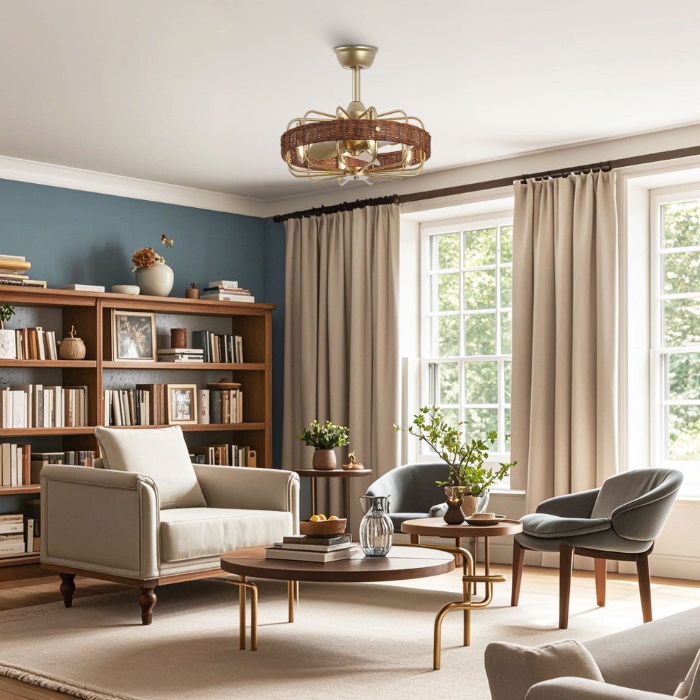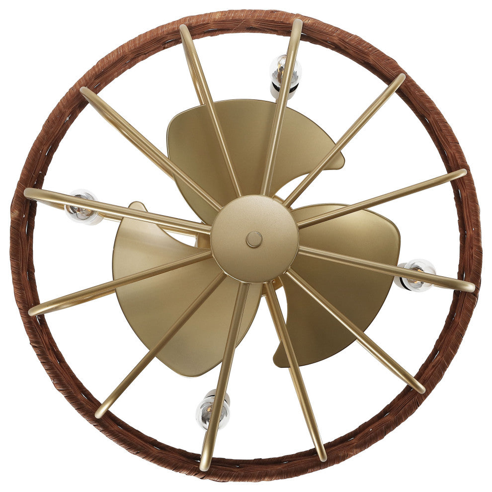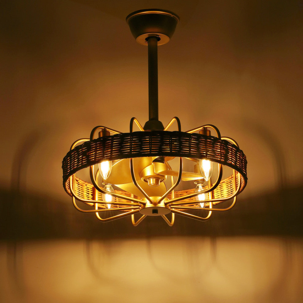 This ceiling fan infuses any space with rustic charm through its vintage-inspired design. Featuring a sleek gold/black metal frame accented by a woven rattan shade, it effortlessly blends elegance with natural textures. The 6-speed motor ensures a smooth, consistent airflow, keeping your environment comfortable without disruptive noise. Perfect for living rooms, bedrooms, or sunrooms, this ceiling fan offers both style and practical comfort, enhancing your home with a sophisticated yet inviting touch.Features:Features textured woven rattan shade for a timeless aesthetic;Requires four E12 socket bulbs, max. 25W per bulb (not included);Reversible motor offers year-round comfort;Remote control allows independent fan and light operation;Includes two downrods(1x5" and 1x12") for adjustable height;