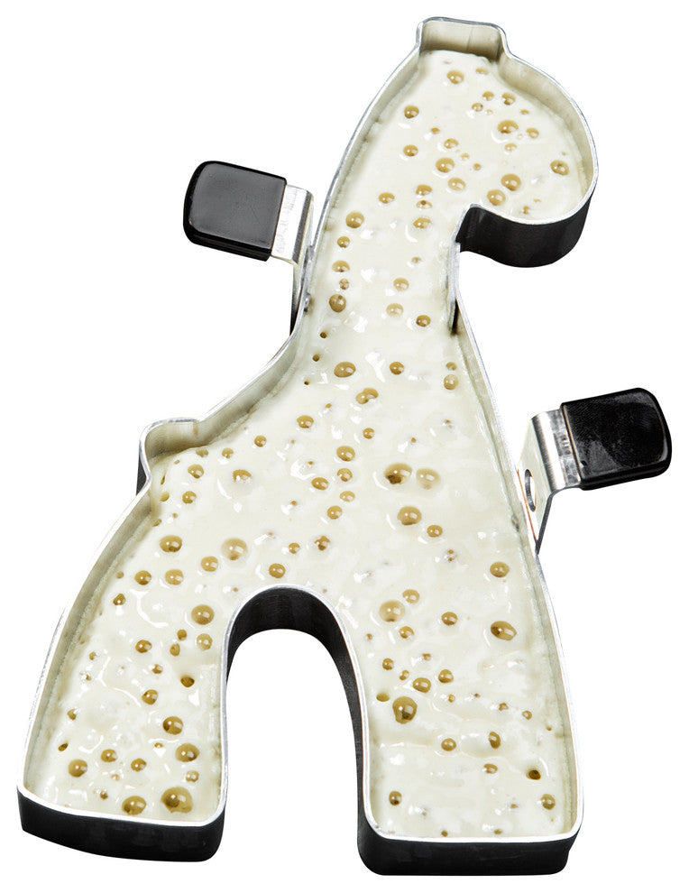 Giraffe Shape-Its Food Forms are manufactured from an aircraft aluminum alloy that has been specially processed to provide years of durable use without losing its shape. These forms work great for shaping any kind of shapeable food (i.e. pancakes, cakes, cookies, gelatin, ice cream, marshmallow treats, brownies and more.) Each form is easy to clean, dishwasher safe, oven safe to 350 degrees and will not rust. All Shape-Its Forms are equipped with folding handles to make storing easy.