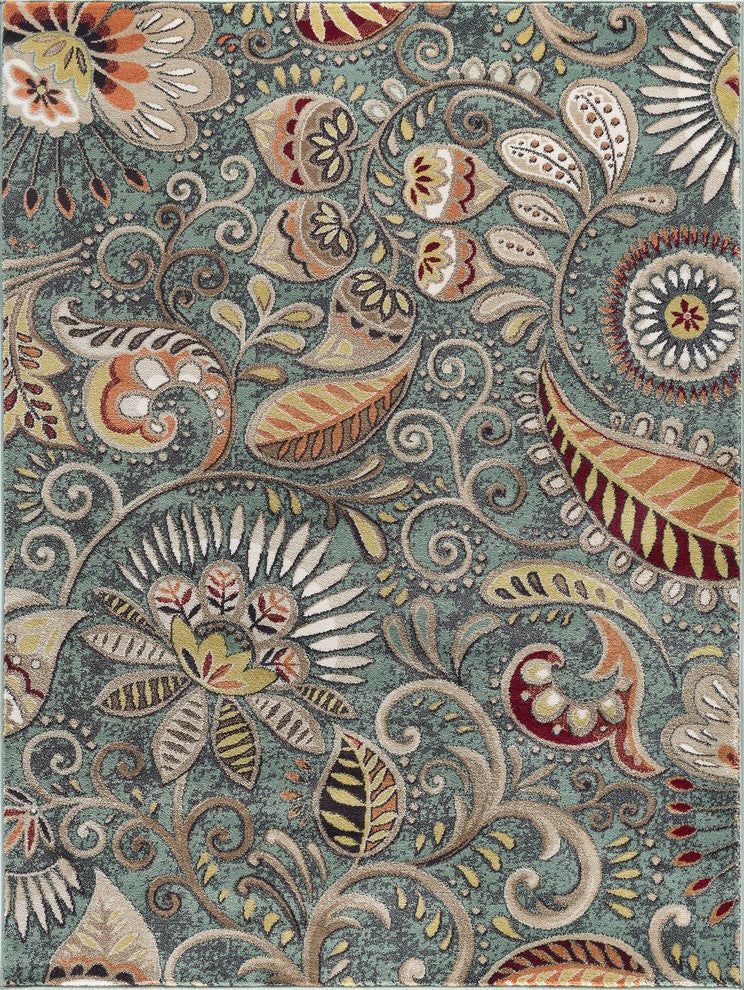The whimsical pattern of the Giselle Transitional Floral Paisley Rug is sure to elicit compliments. With a background dyed in goldleaf, mocha, wine red, citron, lush brown, and creamy ivory, this is a playful rug sure to add charm to any home. This rug comes in various sizes and also in round to create a unified look throughout the home. Outfit your home with quality pieces like this that highlight your distinct decorating style.Machine made of polypropylene to be durable and carefreeVacuum oftenSpot clean when necessary using mild detergent and no bleachColor: SeafoamShape: RectangleDimensions: W 63" x D 87" x H 0.48"Please Note: Due to differences in computer monitors, some product colors may vary slightly.