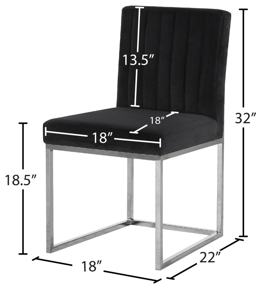 Make a smooth move at your dining area with the velvet stylings of the Giselle chairs. Blending a velvet seat with a chrome frame, these seats are a can''t-miss elegant upgrade in your formal dining room. Even on nights when the meal comes out a little overcooked, the Giselle chairs ensure it''s always a tasteful dining experience.Velvet dining chairsSet of 2Upholstered velvetGold-finished metal frameSimple assembly requiredColor: Black and chromeMaterials: Velvet and metalDimensions: 18" W x 22" D x 32" HSeat Width: 18"Seat Height: 18.5"Seat Depth: 18"