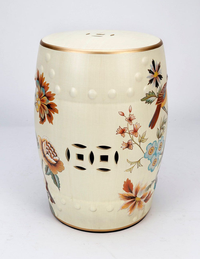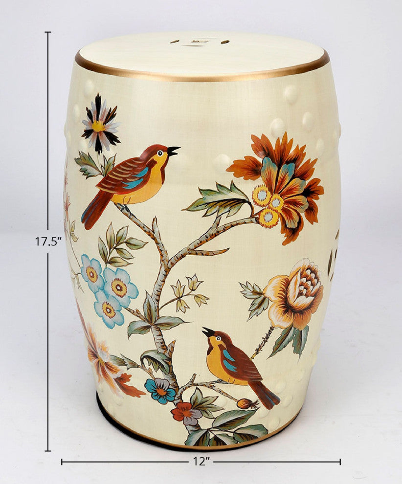 The Glenmore Birds and Flowers Garden Stool is a furniture piece you can place anywhere. It features hand-painted birds and floral designs in a soft beige background. The drum shape allows you to use it as a stool or a table.Features:Overall product dimensions are 12" W x 12" D x 17.5" HSoft beige color with gold accentsDisplays birds and floral designsVersatile piece: you can either use it as stool or an accent tableLow-maintenance and easy to cleanDimensions:Accent StoolAssembled Product: 12 inches wide x 12 inches deep x 17.5 inches high.