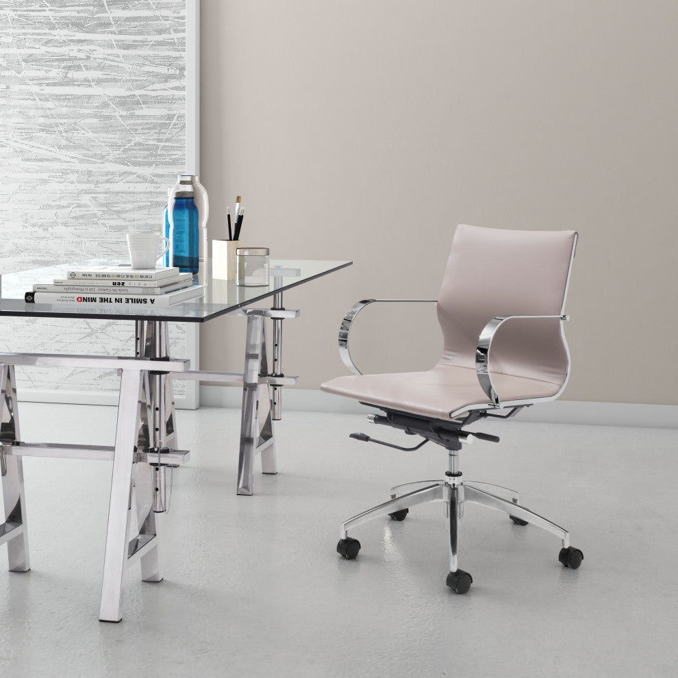 Glider low back office chair features a slim yet comfortable profile with added lumbar support, soft leatherette upholstery and chrome arms. You will sit in elegant fashion as smooth glides create effortless motion. Tilting mechanism and seat height are both adjustable as hydraulic piston sit on metal star base to seamlessly glide you into place. Color options are black, white, gray/taupe leatherette.