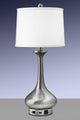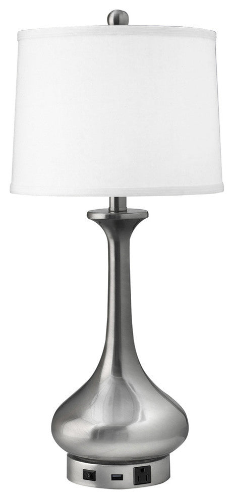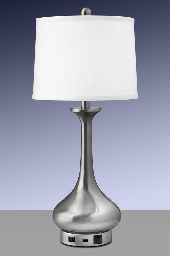 Standard Lamp Specifications for #UWS700:Product Type: Single Nightstand LampHeight: 29"Finish: Brushed SteelConstruction: SteelSocket: (1) Aluminum On/Off Med. Base Type A 100W Max socket(s). (Bulb not included)Switching: (1) On/Off Rocker switch(es) located on the base.Cord: 6''5'' (from base) long black 16 gauge cord set with a 3 prong grounded plug.Electrical Outlet: (1) 3 prong grounded outlet(s).Data Port: None.USB Port: (1) 10W/2A USB port(s).UL/CUL and/or ETL listed: YesHarp Size: 8 inches (including the saddle)Standard Packing: 2 per carton (shade packed separately).Lamps & Shades per SKU: 2Lamping: (1) Aluminum On/Off Med. Base Type A 100W Max socket(s).Shade Size and Description: White fabric laminated to styrene hardback drum with self fold trim measuring 12" x 14" x 10" w/ .5" drop (Top x Bottom x Slant).Bulb Included: NoMaterial Description: constructed from polished, plated, and lacquered steel.