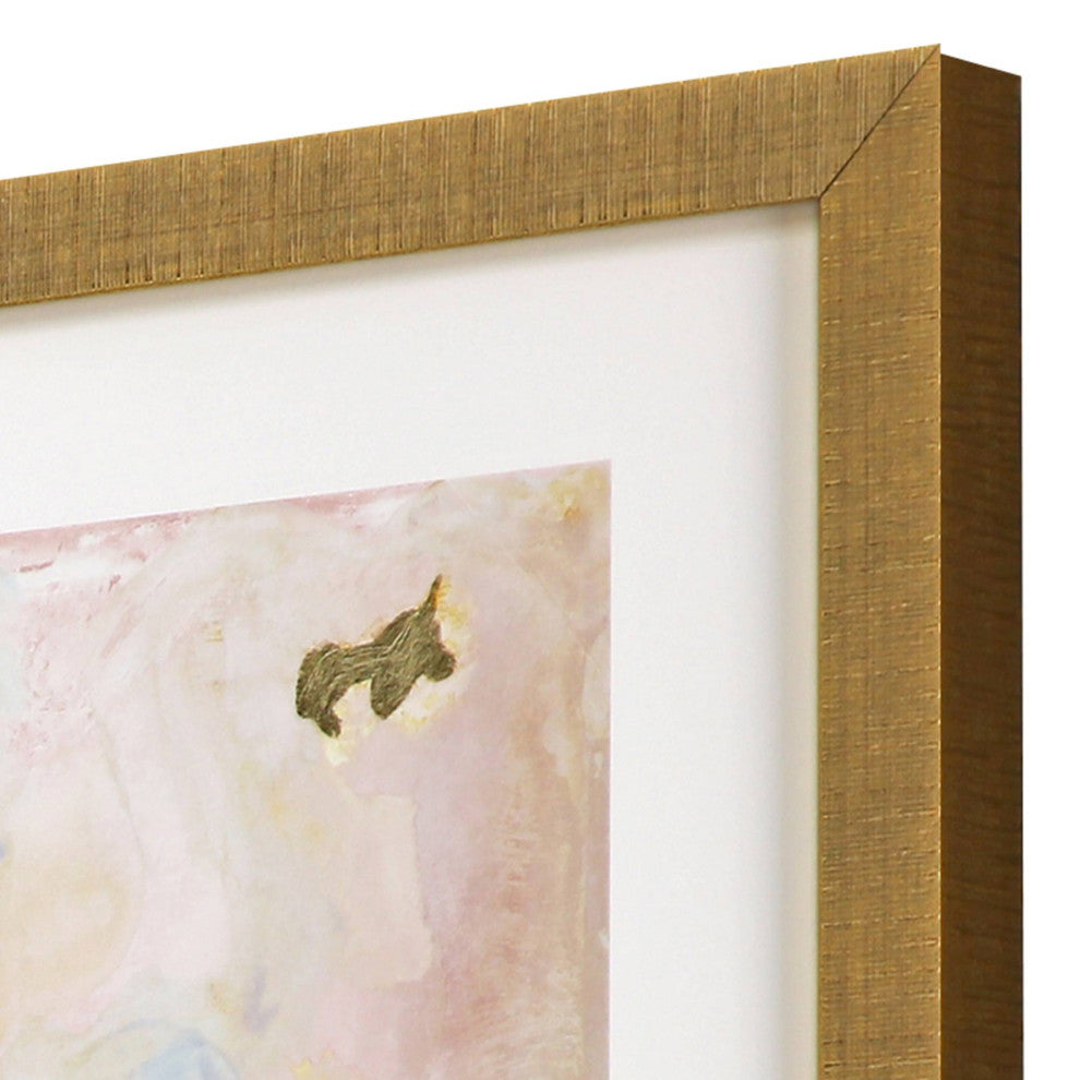 Pink and gold abstracts on fine art paper feature hand applied gold leaf. Framed in a ribbed distressed gold finish moulding.