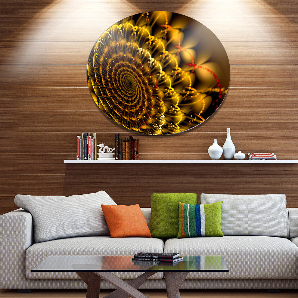 Bring Contemporary Abstraction to your home with this large Circle Metal wall art. This Golden Abstract Spiral Flower Metal Artwork makes it the focal point of any room or office.