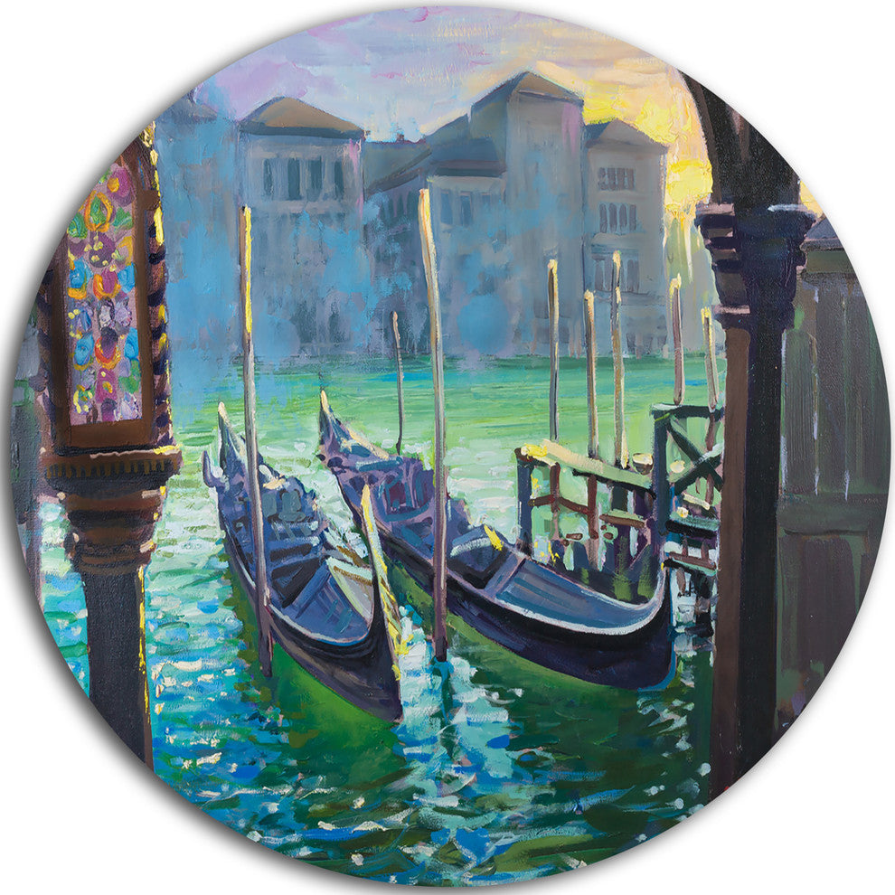 Gondolas In Venice, Landscape Painting Round Metal Wall Art, 11"