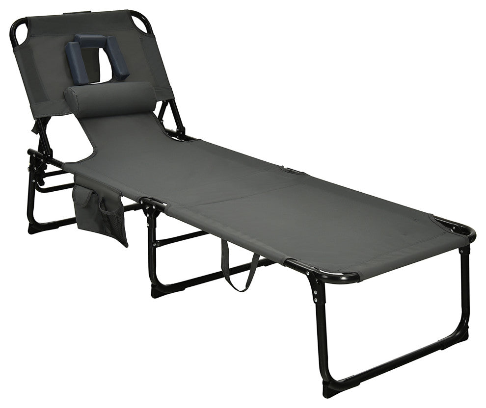 Made of high quality oxford fabric, our lounge chair is sturdy enough to stand the test of time. Besides, the premium steel frame is resistant to high temperatures and rust, so that you can use this beach chair both indoors and outdoors. With high load-bearing capacity up to 330 lbs, you can use this chair without worrying about deformation. In addition, the breathable fabric and ergonomic pillow offer a soft and comfortable sitting experience. The face cavity with 2 arm slots allows you to watch a cell phone or read a book as you like. Additionally, the installation-free design greatly saves your time and energy. 5 adjustable positions meet your different needs, just enjoy your leisure time with this multifunctional beach chair!