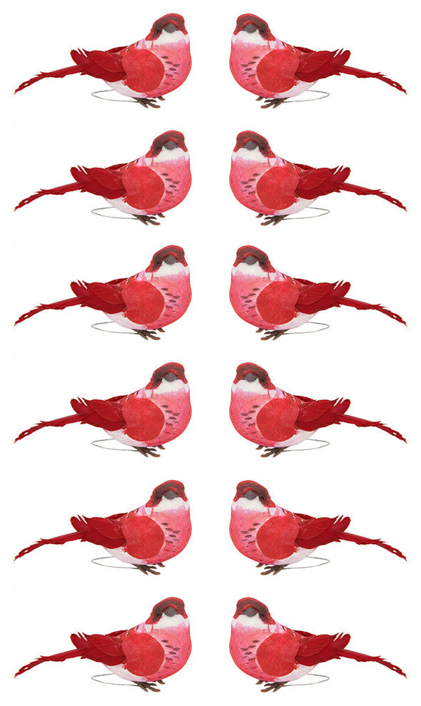 These graceful and elegant bird ornaments feature a hand-painted body and face that is accented with red wing and tail feathersMetal wire is attached to the bottom of each ornament for securing on a Christmas tree, wreath or other desired surfacesRecommended for indoor useDimensions: 4"L x 2"H x 1.5"DMaterial(s): foam/faux feathers/plastic/wire