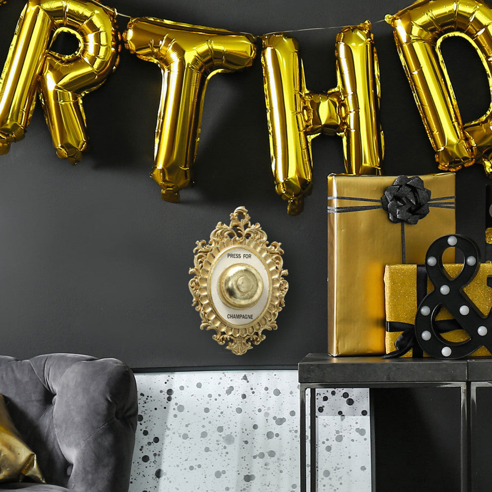 Painted with metallic gold, this ornately framed faux door bell is accented with a white background that neatly contrasts with black text.