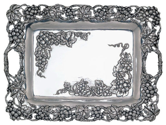 An elegant way to serve snacks, the Grape Clutch Tray by Arthur Court Designs brings the beauty of a vineyard to your dining decor. Crafted from FDA-approved food safe? Aluminum, the Grape Clutch Tray can be chilled in the refrigerator or freezer to keep your appetizers fresh. A portion of all sales of products made by Arthur Court Designs goes to support wildlife education, preservation, and environmental conservation efforts.