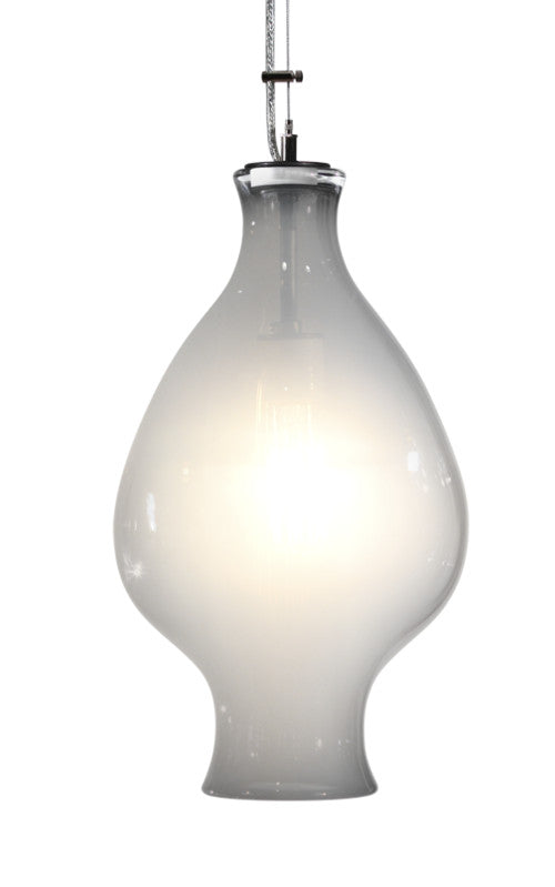 Hand-blown glass pendant by designer Joe Ginsberg. Each pendant in this collection is unique and will vary slightly due to the handmade process of glass blowing. The lighting fixture includes nickel plated hardware with a 5 inch canopy; 6 ft. braided steel electrical cord and an Edison-style Filament bulb. 60w; 120v. Made in the USA.