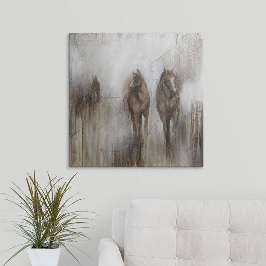 Gallery-wrapped canvas entitled, "Grazing II".Artwork of three horses grazing together in a field of brown on an early foggy morning.Our wrapped canvases feature a proprietary design that prevents warping or sagging over time. By using archival inks and artist-grade canvas, our premium canvases are sure to add that extra touch to any space. Lastly, our canvases are finished with a closed back that incorporates pre-installed hanging hardware for easy installation.