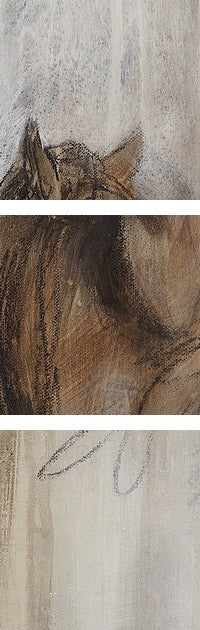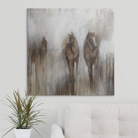 Gallery-wrapped canvas entitled, "Grazing II".Artwork of three horses grazing together in a field of brown on an early foggy morning.Our wrapped canvases feature a proprietary design that prevents warping or sagging over time. By using archival inks and artist-grade canvas, our premium canvases are sure to add that extra touch to any space. Lastly, our canvases are finished with a closed back that incorporates pre-installed hanging hardware for easy installation.