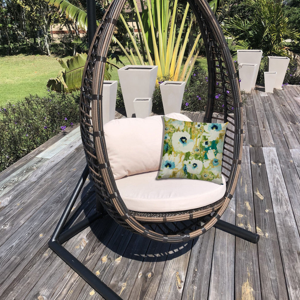 Enchant your guests with this art-deco Green Botanical Indoor Outdoor Zippered Pillow Cover that is sure to complement any contemporary decor. Impressionistically printed flowers in white and blue lay on a bed of abstract green and gold splatters that covet a sophisticated allure. The pillows are constructed with a high-quality polyester material that ensures pristine conditions even after years of usage. Fortified with UV resistant qualities, these pillows can be left in direct sunlight for up to 500 hours without the slightest chances of fading and are water resistant, preventing any growth of mildew, making them perfect for both indoor and outdoor usage. The pillow cover features a neatly done zipper closure for ease of cleaning. Elevate the design elements in your contemporary home by adding a touch of abstract boho that adds a classy allure. 19.5" x 19.5" x 0.25"