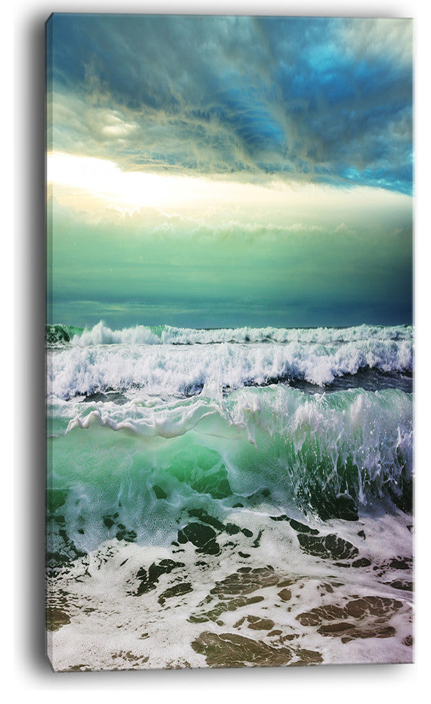 The Green Foaming Waves and Blue Sky canvas art print is sure to make an impression on anyone who sees it. This artwork is gallery wrapped around a 1-inch solid wood frame and arrives carefully packaged and entirely ready to hang on the wall. Design Art only uses the highest resolution and pigments to ensure a crisp colorful print that is never faded or pixelated. This artwork is sure to be a conversation starter in any home or office.