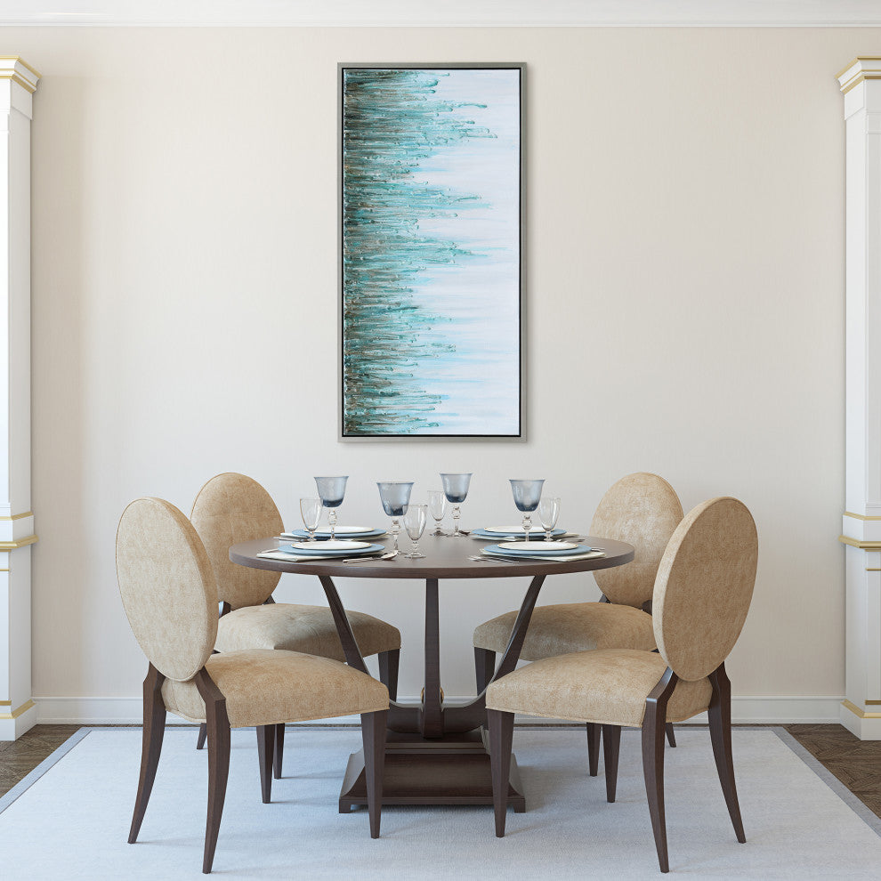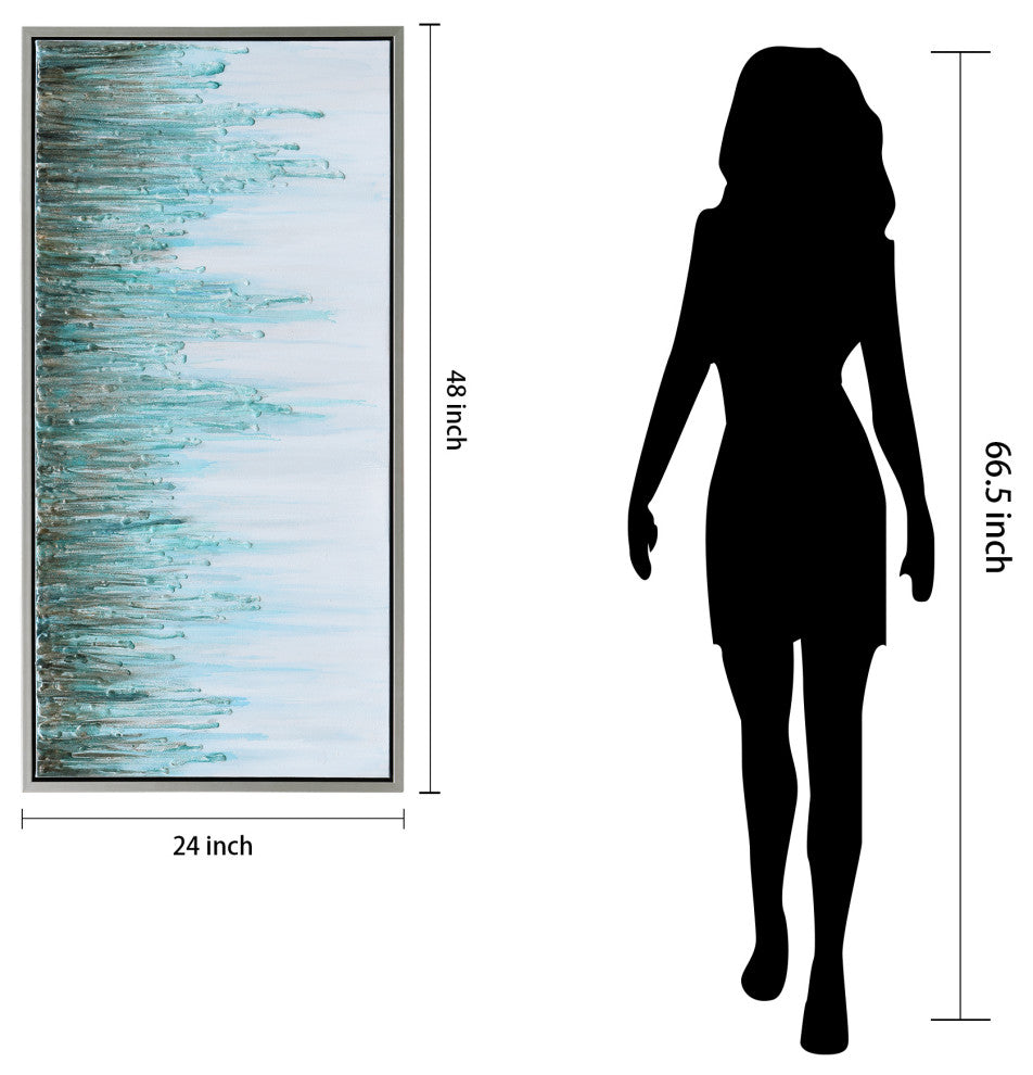 Artist Martin Edwards loves the texture and feel of paint and the sensuous beauty of color and tries to make the most of these two elements in his original works of art. This specific style shouts movement and mood as it moves across the canvas and the color only serves to intensify the emotion displayed. This piece uses subtle variations in technique and oil paint combinations to display a three-dimensional, hand-painted, piece of art that displays an abstract silver and green image that has been embellished with glitter. Surrounding this piece is a strong, champagne frame. Comes with 4 pre-installed D-rings which make it simple to display on any wall vertically or horizontally, depending on your preference.