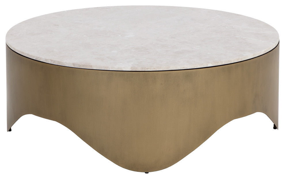 The Guinevere Coffee Table will be the crowning centrepiece of any living space. Characterized by a curvy base handcrafted from powder-coated iron with an antique brass finish. A crema Italian marble tabletop brings out the warm tones in this piece. As marble is a natural material, unique veining, pitting, fissures, micro-cracks and colour variations are all characteristics that add to the uniqueness and beauty of each piece. Made in India. With refined craftsmanship, this design was brought to life by skilled local artisans. Due to the nature of handcraftsmanship, unique imperfections such as fissures, markings and variations in colour and shape are welcomed and appreciated characteristics for a truly one-of-a-kind piece.