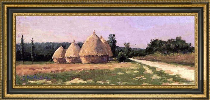 14" x 28" Gustave Caillebotte Landscape with Haystacks framed premium canvas print reproduced to meet museum quality standards. Our Museum quality canvas prints are produced using high-precision print technology for a more accurate reproduction printed on high quality canvas with fade-resistant, archival inks. Our progressive business model allows us to offer works of art to you at the best wholesale pricing, significantly less than art gallery prices, affordable to all. This artwork is hand stretched onto wooden stretcher bars, then mounted into our 3 3/4" wide gold finish frame with black panel by one of our expert framers. Our framed canvas print comes with hardware, ready to hang on your wall. We present a comprehensive collection of exceptional canvas art reproductions by Gustave Caillebotte.
