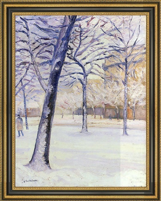 21" x 28" Gustave Caillebotte Park in the Snow Paris framed premium canvas print reproduced to meet museum quality standards. Our Museum quality canvas prints are produced using high-precision print technology for a more accurate reproduction printed on high quality canvas with fade-resistant, archival inks. Our progressive business model allows us to offer works of art to you at the best wholesale pricing, significantly less than art gallery prices, affordable to all. This artwork is hand stretched onto wooden stretcher bars, then mounted into our 3 3/4" wide gold finish frame with black panel by one of our expert framers. Our framed canvas print comes with hardware, ready to hang on your wall. We present a comprehensive collection of exceptional canvas art reproductions by Gustave Caillebotte.