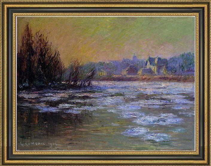21" x 28" Gustave Loiseau Ice on the Oise river framed premium canvas print reproduced to meet museum quality standards. Our Museum quality canvas prints are produced using high-precision print technology for a more accurate reproduction printed on high quality canvas with fade-resistant, archival inks. Our progressive business model allows us to offer works of art to you at the best wholesale pricing, significantly less than art gallery prices, affordable to all. This artwork is hand stretched onto wooden stretcher bars, then mounted into our 3 3/4" wide gold finish frame with black panel by one of our expert framers. Our framed canvas print comes with hardware, ready to hang on your wall. We present a comprehensive collection of exceptional canvas art reproductions by Gustave Loiseau.