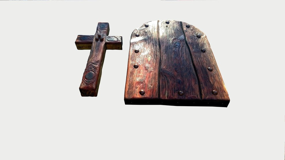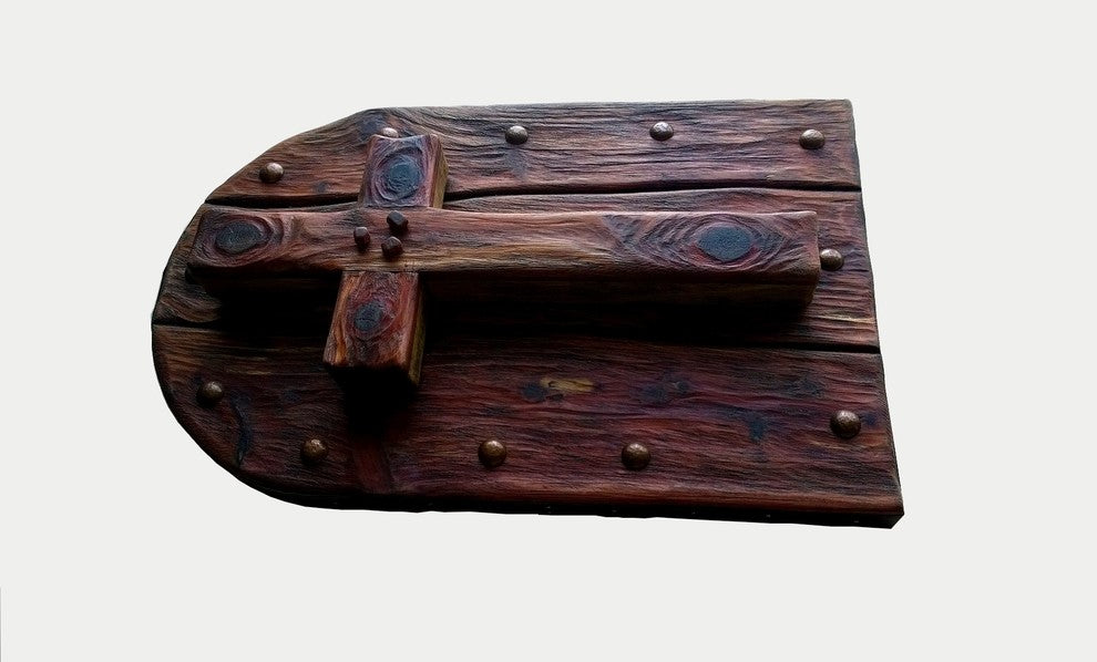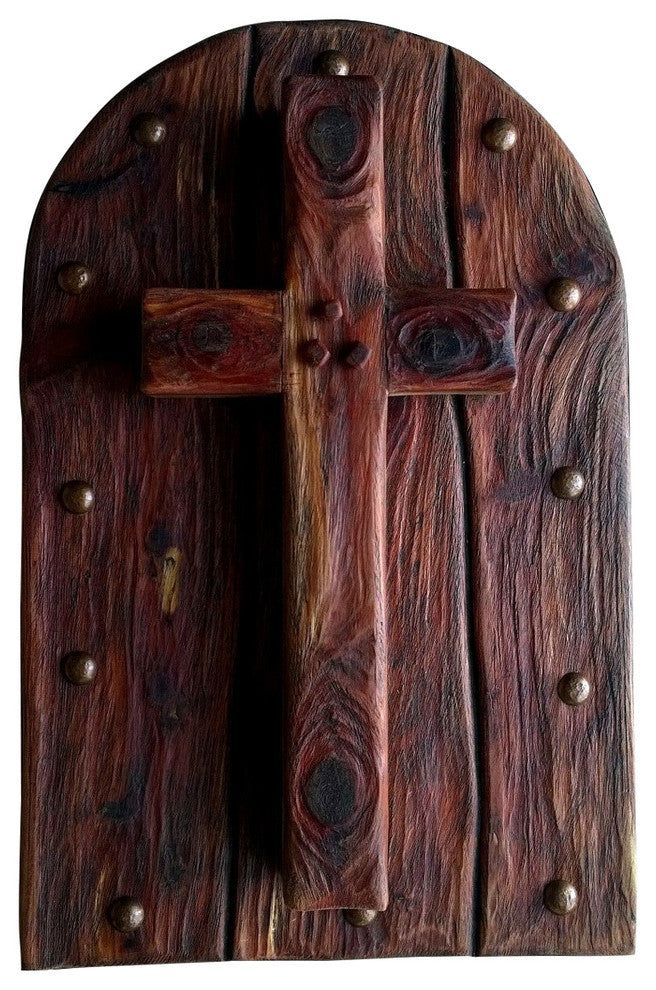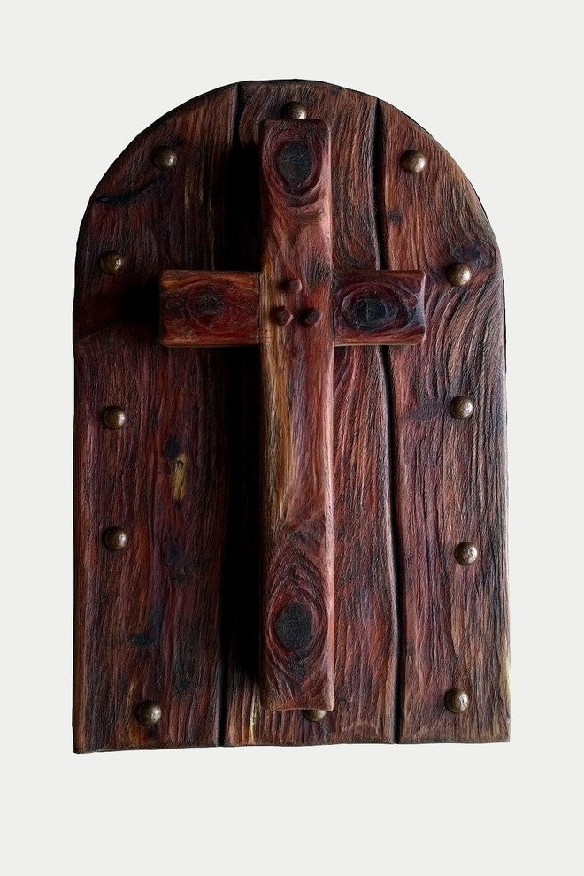 Unique design hand carved cross. Cedar cross, cedar&pine background. Natural wood finish. This cross with special meaning. Three wooden pins in the middle "“ for Holy Trinity, 12 metal pins "“ for 12 Apostles. Unique design and interesting idea!All my artwork is made-to-order. Each art piece is unique and not a replica. I don''t do replicas and work only with new materials what makes my art long-lasting, safe and sturdy.