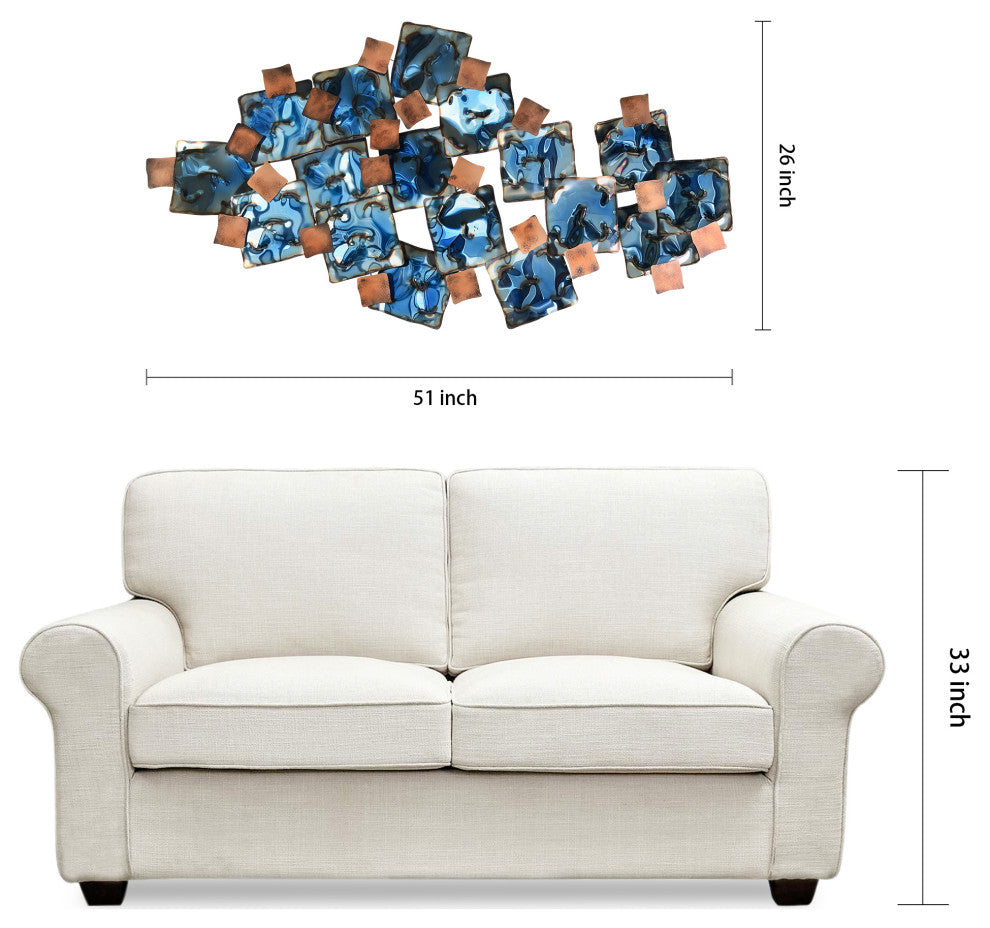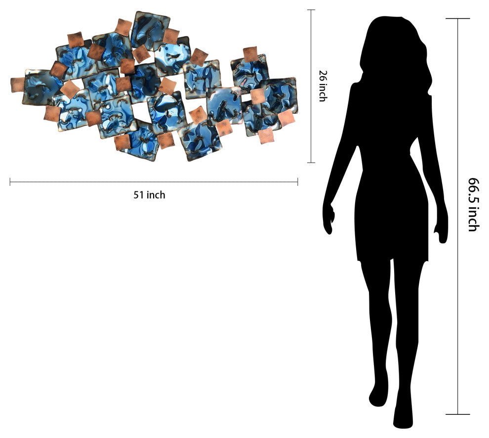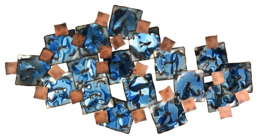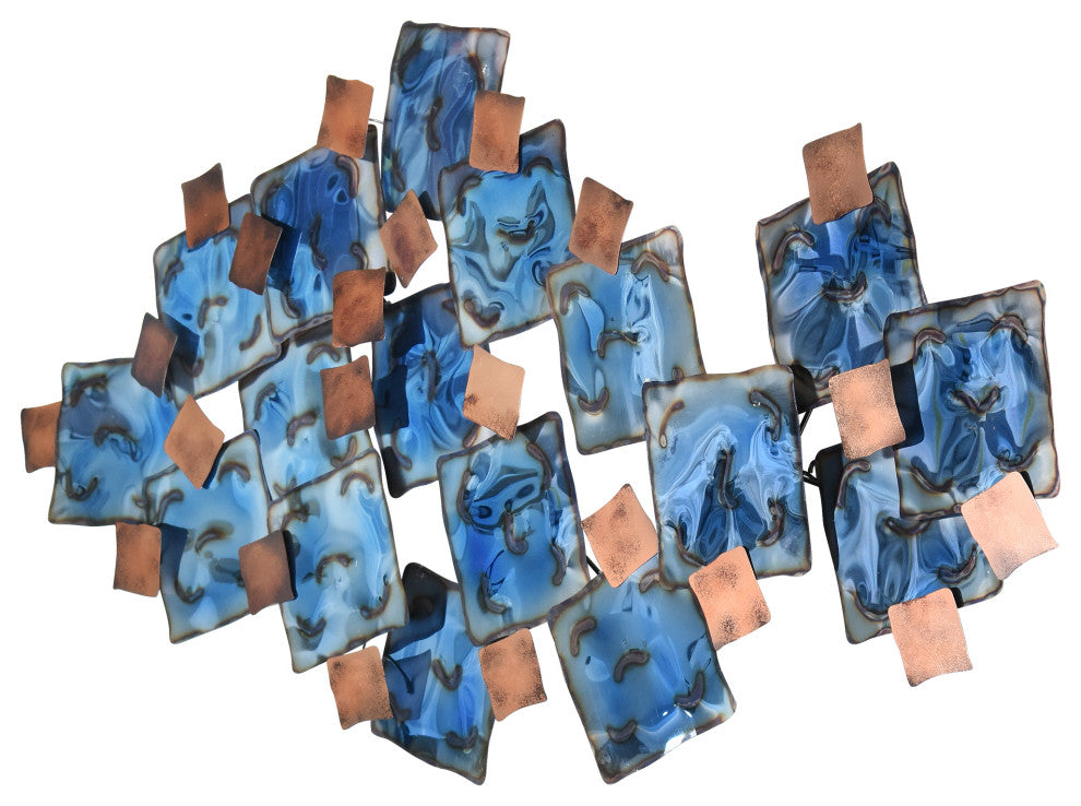 This piece is truly unusual, a mixture of gleaming metal squares with smaller, almost brick-like squares arrayed throughout. The squares are tile-like and have an iridescent blue tone, which will make this piece ideal for a wall that catches sunlight. This undefinable work will draw the attention of guests and create a talking point; does it represent the depths of the ocean, or something more abstract like the depths of the mind?