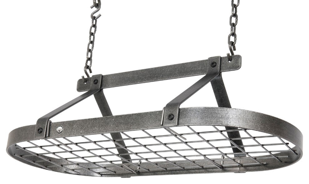 One of Enclume''s most popular designs, this classic Enclume Oval Ceiling Pot Rack is Handcrafted in the USA of solid high Carbon Steel. This hanging pot rack stores cookware within easy reach, saving cabinet space and creating the ambiance of a professional kitchen. Here are some key features and details about this ceiling pot rack: Materials - The rack is crafted from solid carbon steel. The solid carbon steel gives the rack durability and a rustic, artisanal appearance. Design - This hanging celiing rack is based on a French design which allows you to store your cookware and utensils in one place, making them easily accessible. This not only helps to save cabinet space but enhances the culinary environment in your kitchen with a simple yet beautiful design. Finish - The rack features Enclume''s authentic hammered steel finish highlighting its natural appearance. The aesthetics of the rack give it a contemporary yet modern industrial look. It is a favorite of many home chefs and culinary professionals. A standout piece in your kitchen decor. Includes 12 Straight Multi-Purpose Pot Hooks. Real Solid Carbon Steel, Professional Grade. Forged by our Skilled Craftsmen in the Pacific Northwest, USA. Assembly Required. Hardware and Installation Instructions Included. Mounting directly into ceiling joists or beams is recommended. Consult your handyman or local hardware store for mounting to drywall or your specific ceiling type.