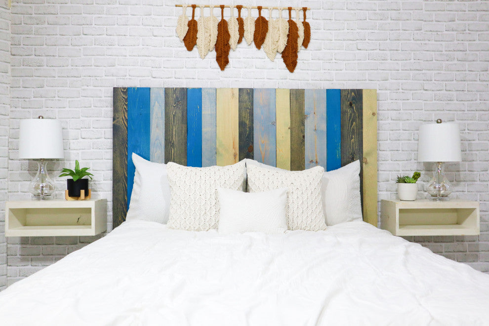 [Floating Panels] Built with individual panels that can be easily hung side by side onto the wall like a picture frame. They do not attach to a bed frame, as the height can be adjusted to your convenience.[Real Wood] A simple and beautiful minimalist handcrafted headboard made with real wood, creating a clean and clutter-free space thats perfect for relaxing and pleasing to the eye and mind. Boards are brushed-stain individually to give them a rustic look. Since it is real wood there will be some natural variations like knots or splits. These aren''t defects, but natural imperfections which add to the charm of your one of a kind table.[Durable & Sturdy Structure] Sealed with polycrylic for durability and watermark resistant. MADE IN GILBERT, ARIZONA.[Natural Wood Color] The Winter Mix design has a combination of stains and weathered colors which are: STAINS - Charcoal Gray, Winter Sky, Driftwood. WEATHERED - Teal. Each shiplap has the tendency to absorb the paint and stain differently, therefore the finish may slightly vary from the pictures on display.[DIMENSIONS] Number of panels included in this set: 3. Overall Dimensions: Length 55.5" x Width 2" x Height 36".