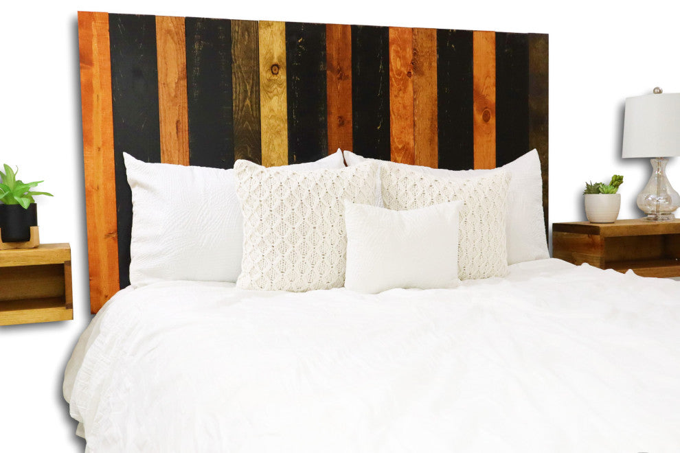 [Leaner Panels] Built with individual panels that are placed side by side and leaned on the wall after they are assembled together. The bed acts as the main support to the headboard, however double sided Velcro strips that stick on the wall are included for additional support. Headboard is very sturdy and will not move or bang against the wall.[Real Wood] A simple and beautiful minimalist handcrafted headboard made with real wood, creating a clean and clutter-free space thats perfect for relaxing and pleasing to the eye and mind. Boards are brushed-stain individually to give them a rustic look. Since it is real wood there will be some natural variations like knots or splits. These aren''t defects, but natural imperfections which add to the charm of your one of a kind table.[Durable & Sturdy Structure] Sealed with polycrylic for durability and watermark resistant. MADE IN GILBERT, ARIZONA.[Natural Wood Color] The Cabin Mix design has a combination of stains and weathered colors which are: STAINS - Gunstock, Ebony, Honey. WEATHERED - Black. Each shiplap has the tendency to absorb the paint and stain differently, therefore the finish may slightly vary from the pictures on display.[DIMENSIONS] Number of panels included in this set: 3. Overall Dimensions: Length 64.5" x Width 2" x Height 58".