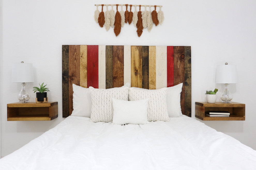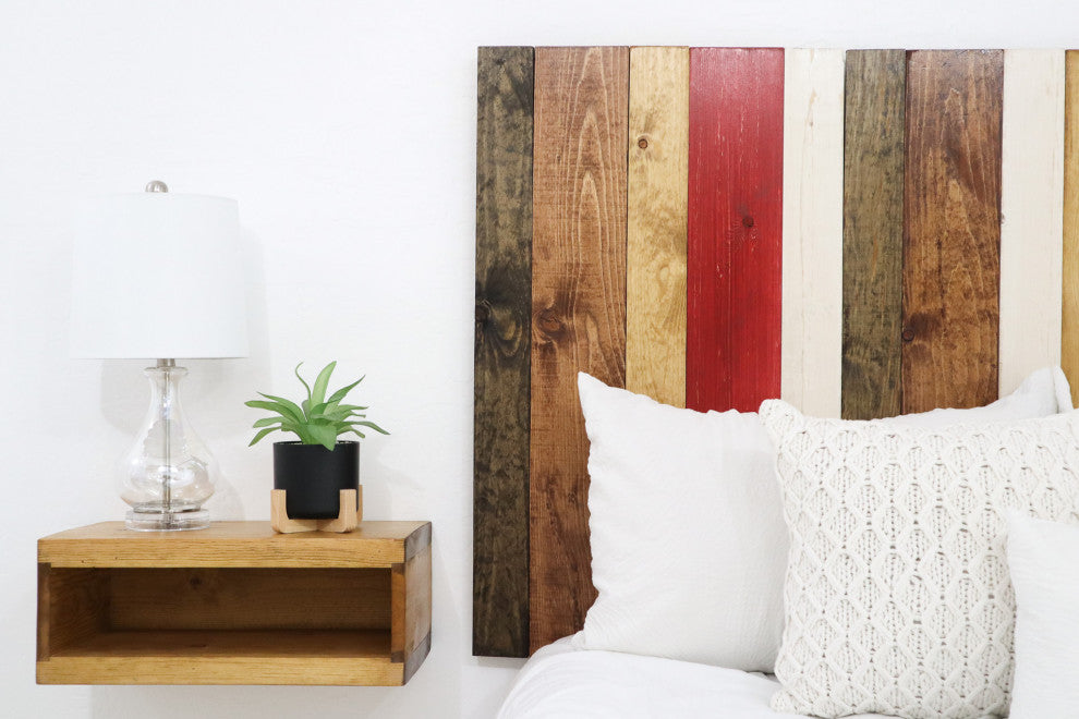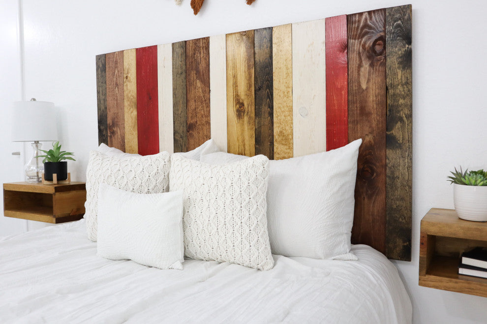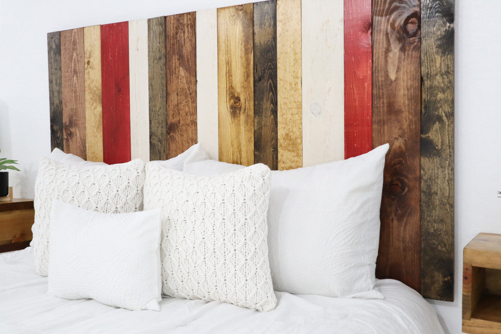 [Leaner Panels] Built with individual panels that are placed side by side and leaned on the wall after they are assembled together. The bed acts as the main support to the headboard, however double sided Velcro strips that stick on the wall are included for additional support. Headboard is very sturdy and will not move or bang against the wall.[Real Wood] A simple and beautiful minimalist handcrafted headboard made with real wood, creating a clean and clutter-free space thats perfect for relaxing and pleasing to the eye and mind. Boards are brushed-stain individually to give them a rustic look. Since it is real wood there will be some natural variations like knots or splits. These aren''t defects, but natural imperfections which add to the charm of your one of a kind table.[Durable & Sturdy Structure] Sealed with polycrylic for durability and watermark resistant. MADE IN GILBERT, ARIZONA.[Natural Wood Color] The Fall Mix design has a combination of stains and weathered colors which are: Dark Walnut, Honey, Golden Oak, Red, Whitewash. Each shiplap has the tendency to absorb the paint and stain differently, therefore the finish may slightly vary from the pictures on display.[DIMENSIONS] Number of panels included in this set: 3. Overall Dimensions: Length 64.5" x Width 2" x Height 58".