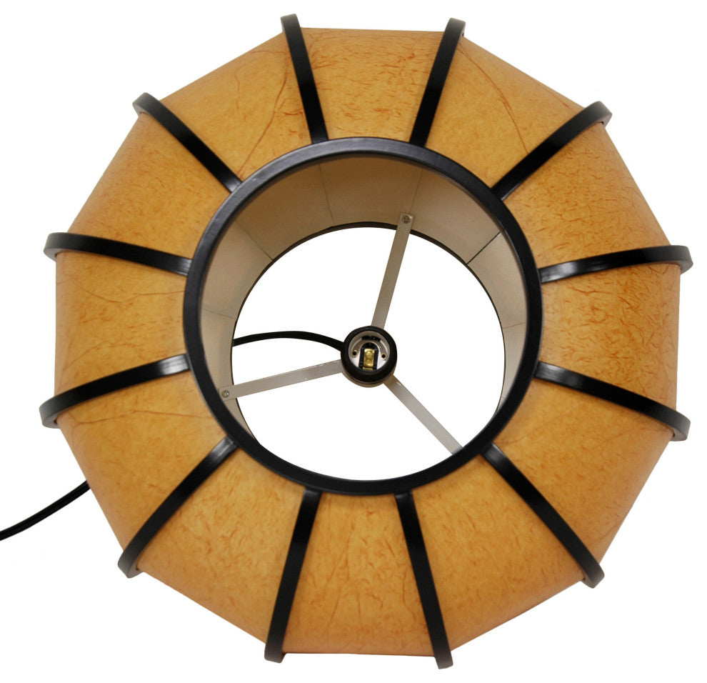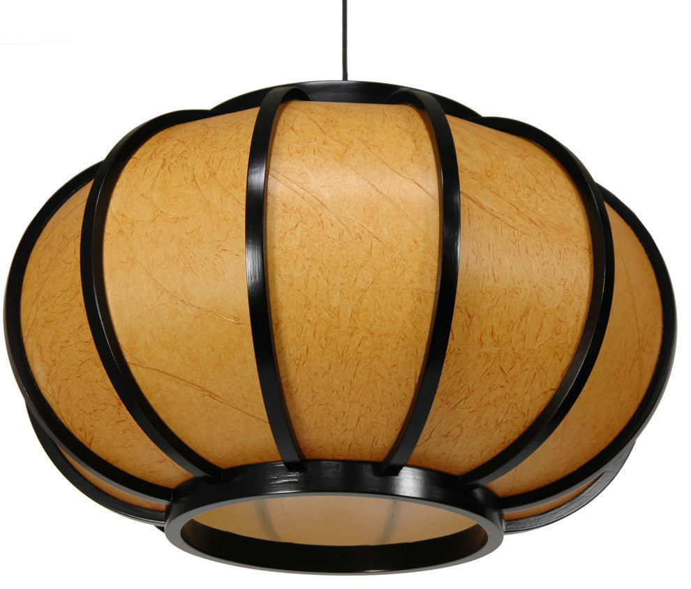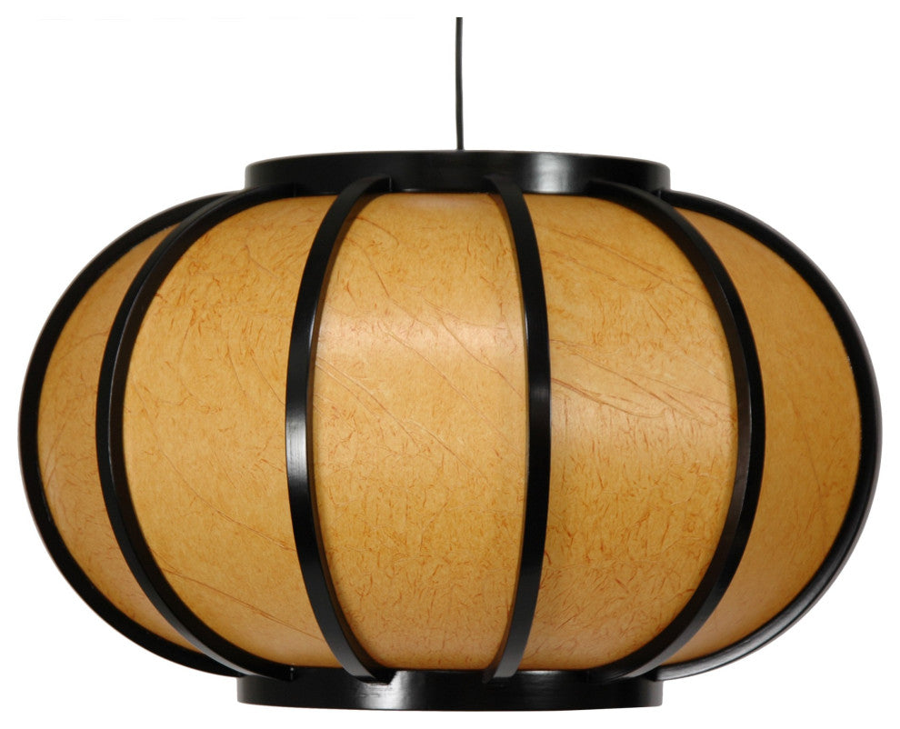Round Japanese hanging lantern with a lightweight black lacquered wood frame. Fiber-reinforced pressed pulp rice paper is dyed a warm golden tan with darker fiber texture patterns. Tinted shade gives the naturally soft lantern light an even warmer glow. Does not need to be professionally installed but does require a ceiling hook or hanging lamp pole, not included. Wired for American standard light bulbs and electrical outlets.Modern Japanese Design - Seamlessly blends traditional Japanese materials and aesthetics with a fresh, modern vibe to create a contemporary classic suitable for all styles from midcentury modern to boho.Soft Glow - Bathing your space in a luminous aura, these fixtures emit a breathtakingly beautiful, soft, warm, and indirect light, enhancing the ambiance and creating a cozy and inviting atmosphere.UL Approved - Rest assured knowing that the wiring and sockets meet stringent UL standards, guaranteeing not only safety but also flawless compatibility with American-made light bulbs40 Watt Type A Compatibility - Specifically engineered to accommodate 40W medium type A compact fluorescent bulbs, a standard that provides versatility in lighting options to suit various preferences and atmospheres.67" Cord with Switch - Easily plugs into standard American outlets and includes a convenient switch integrated into the cord for effortless operation. A professional electrician can easily convert this to install directly into the ceiling.Uses a 40 Watt medium bulbCord measures 67" in length