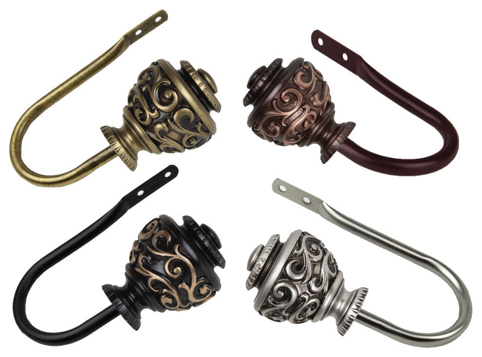 Finish off the look of your window hardware with matching holdback sets. High quality steel J hooks and Resin finials. Perfect for tying back curtains to the side when draperies are open.Includes 2 J Hooks, Finials, and Mounting Hardware.Projection: 3"Finial measurement: 2.875" W x 2.5" H x 2.5" D