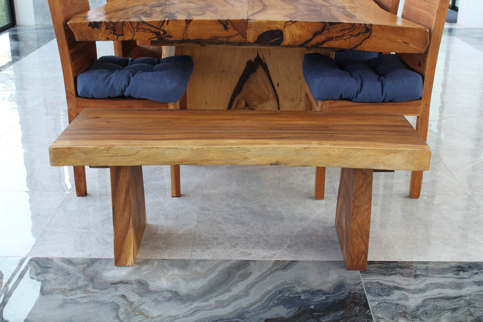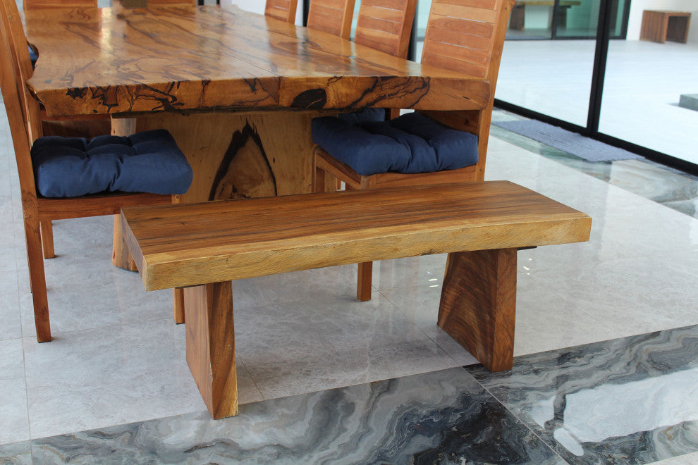 This Natural Edge Bench has a straight back to be put against a wall, and yet shows off the natural edges of the wood on the front edge where they can be viewed and admired for their naturally flowing lines. Also use as table seating with the straight edge for leg comfort. Doubles again as a party seat or temporary mixer stand. Place in front of a sofa or chairs for a multipurpose coffee table. Stack up two of these works of art as a shelving system when not in use