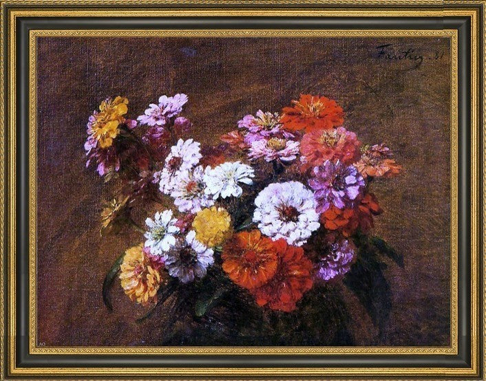 21" x 28" Henri Fantin-Latour Zinnias in a Vase framed premium canvas print reproduced to meet museum quality standards. Our Museum quality canvas prints are produced using high-precision print technology for a more accurate reproduction printed on high quality canvas with fade-resistant, archival inks. Our progressive business model allows us to offer works of art to you at the best wholesale pricing, significantly less than art gallery prices, affordable to all. This artwork is hand stretched onto wooden stretcher bars, then mounted into our 3 3/4" wide gold finish frame with black panel by one of our expert framers. Our framed canvas print comes with hardware, ready to hang on your wall. We present a comprehensive collection of exceptional canvas art reproductions by Henri Fantin-Latour.