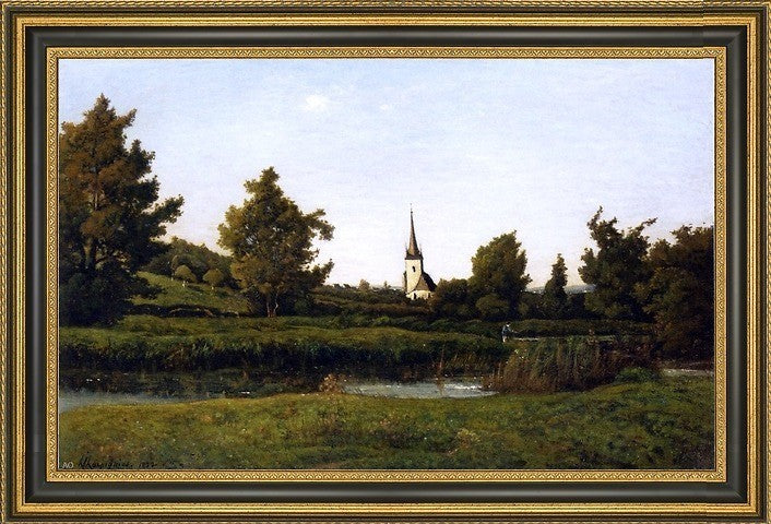16" x 24" Henri Harpignies View of a Village framed premium canvas print reproduced to meet museum quality standards. Our Museum quality canvas prints are produced using high-precision print technology for a more accurate reproduction printed on high quality canvas with fade-resistant, archival inks. Our progressive business model allows us to offer works of art to you at the best wholesale pricing, significantly less than art gallery prices, affordable to all. This artwork is hand stretched onto wooden stretcher bars, then mounted into our 3 3/4" wide gold finish frame with black panel by one of our expert framers. Our framed canvas print comes with hardware, ready to hang on your wall. We present a comprehensive collection of exceptional canvas art reproductions by Henri Harpignies.