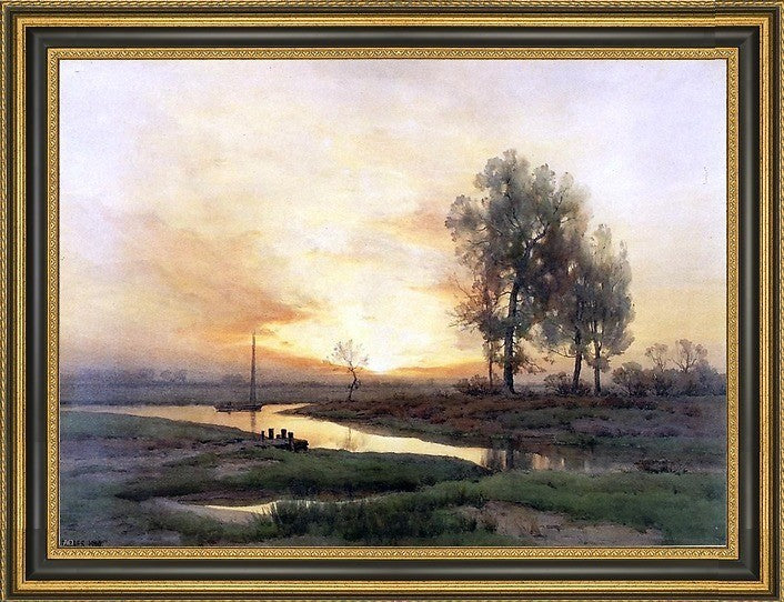 18" x 24" Henry Farrer Evening Sail framed premium canvas print reproduced to meet museum quality standards. Our Museum quality canvas prints are produced using high-precision print technology for a more accurate reproduction printed on high quality canvas with fade-resistant, archival inks. Our progressive business model allows us to offer works of art to you at the best wholesale pricing, significantly less than art gallery prices, affordable to all. This artwork is hand stretched onto wooden stretcher bars, then mounted into our 3 3/4" wide gold finish frame with black panel by one of our expert framers. Our framed canvas print comes with hardware, ready to hang on your wall. We present a comprehensive collection of exceptional canvas art reproductions by Henry Farrer.