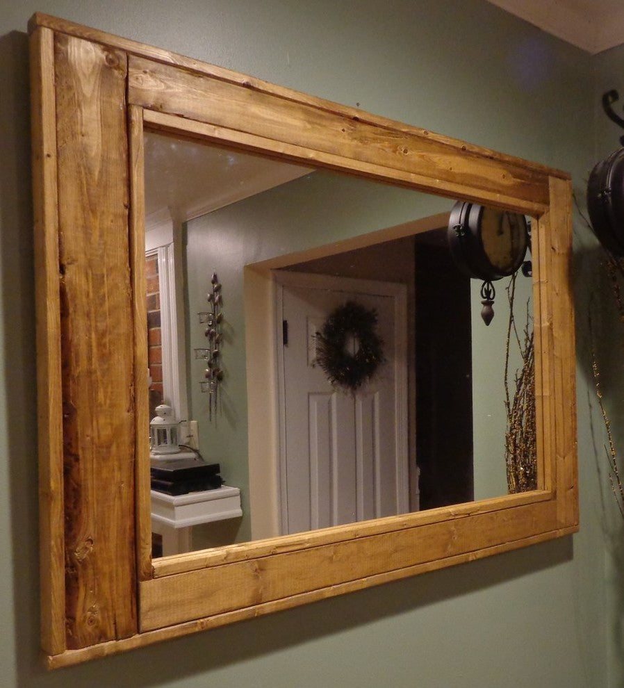 Give any room in your home charm with this handmade reclaimed styled wood mirror. The wood has been given new life sanded and restored. It now it deserves a place to rest holding a mirror for your family and friends to enjoy for years to come.This is our thick bottom version, made to mimic the look of a window with a thicker bottom edge. Each side is 4 inches thick except for the bottom piece which is 5 inchesOur mirrors are built by hand in our wood shop in Warrington, PA. Dimensions:30"(w) x 24"(h)36"(w) x 30"(h)42"(w) x 30"(h)Also available to be mounted both Horizontally and VerticallyBuilt with premium knotty pine wood, first quality mirror glass, screwed on saw tooth hangers are attached for easy hanging on any wall.Note: Each mirror will look slightly different in color and character as the pieces of wood are unique.Each Mirror is made with High Quality 1/4 mirrored glass. At Lane of Lenore we breathe life into old items to give them a new purpose. All of our items are refurbished parts we''ve come across over the years and are handmade for you to use and display in your own home. Lane of Lenore is a collection of handcrafted mirrors and items created from reclaimed materials. From mirrors made from 100+ year old windows, to shelving made from 200+ year old lumber Lane of Lenore finds ways to create a historic, yet artistic style for your home.