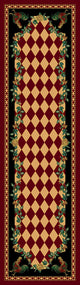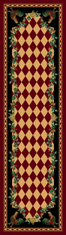 Add a touch of country charm with this timeless design. Regal Roosters frame harliquin diamonds. Traced in pretty roses this rug will interject some color into your space. Made from premium EnduraStran nylon this rug is easy to clean and made in AMERICA. Available in 6 sizes.